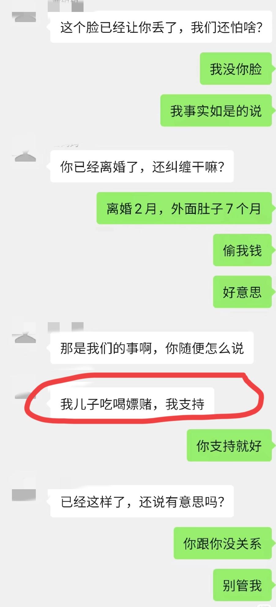 7月份离婚,9月份发现前夫带三姐产检,一个月后三姐生娃。 一位邯郸网友晒出与前婆婆对话截图,前婆婆怪她网上说家事丢人,还发声支持儿子。 该网友说是有人找上门要账,才发现她前夫不但变卖她黄金首饰,还在用她支付宝借呗套现。 两人离婚后,她朋友又在妇幼医院看到前夫哥与三姐去产检。 另: 她与前夫有个一周岁左右大的女儿。 想起网上看到的一句话,女人这辈子得保护好自己两样东西,肚子和钱包。 遇人不淑很麻烦,果断脱身何尝不是及时止损呢!