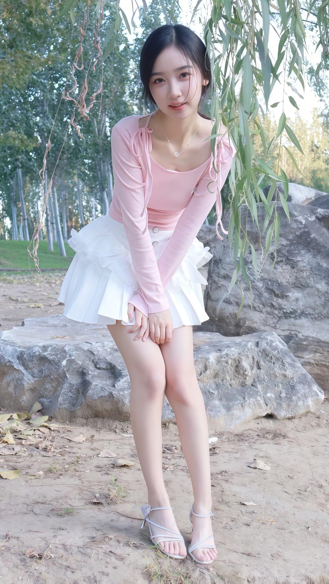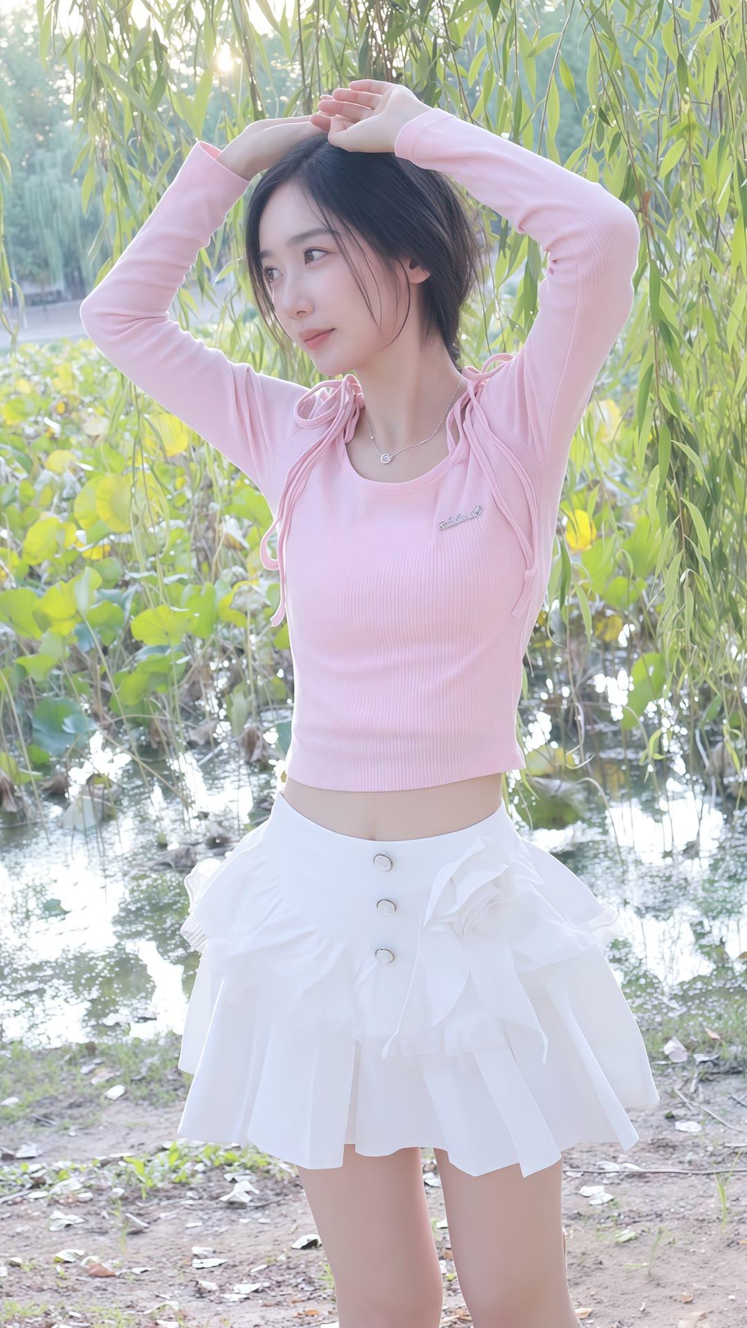 少女心满满,粉色长袖搭配白色短裙,在湖边漫步,享受美好时光。🌸💕