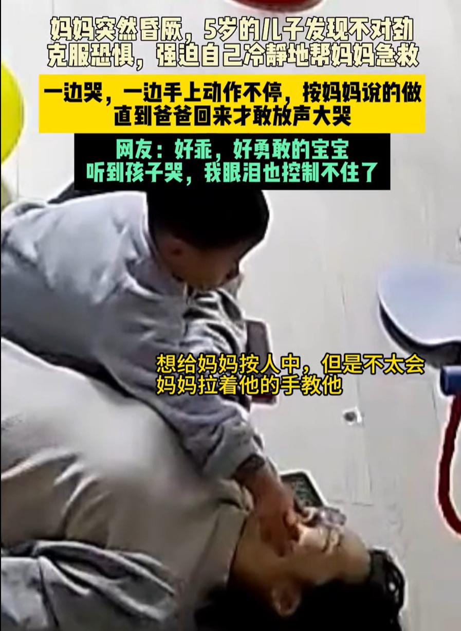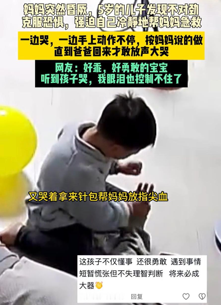 这个孩子是上天派来的天使吧!山东,一名女子在家里陪5岁的孩子,结果突然昏厥,从凳子摔到地上,孩子听到声音后连忙过来查看,虽然哭的伤心,但手上的动作却一直没停,又是掐人中,又是放指尖血,等爸爸回到家,他这才放声痛哭起来 家庭监控显示,当天李女士在家里陪着5岁的儿子童童,突然一阵眩晕袭来,低血糖发作了。她还没来得及反应,整个人就从凳子上摔到了地上。砰的一声闷响,惊动了正在玩耍的孩子 童童跑过来,看到妈妈躺在地上,四肢有些僵硬,喊也喊不醒。小男孩的眼泪一下子就涌出来了,但他没有只是站在那里哭。先是给爸爸打电话,然后他记得妈妈之前教过他的:人中,掐人中 小手有些颤抖,但还是准确地按在了妈妈的人中穴上。一下,两下,边哭边按 没过一会,妈妈有了意识,但还是无法起身,告诉孩子把针包拿过来,在手指尖扎一下,五岁的孩子,捏着那根细细的针,找准妈妈手上的合谷穴,小心翼翼地扎了下去。他的手在抖,眼泪不停地流,但动作却没有停 时间一分一秒过去,童童一边观察妈妈的情况,一边继续施救。他其实害怕极了,一个五岁的孩子,面对突然倒下的妈妈,心里的恐惧可想而知。但他撑住了,按照记忆里妈妈教过的方法,一步一步做着 就这样,硬撑了20分钟 直到门外传来钥匙转动的声音,爸爸回来了 童童抬头看到爸爸的那一刻,一直强忍着的情绪终于崩溃,放声大哭起来。那哭声里,有害怕,有委屈,也有终于可以卸下重担的释放 我们常说,孩子是父母的软肋。但很多时候,他们也是我们的铠甲。一个五岁的孩子,在突发状况面前表现出来的冷静和执行力,让很多成年人都自愧不如。他不是不害怕,而是在害怕的同时,选择了行动 这件事让我想起一个问题:我们给孩子什么样的教育,他们就会成为什么样的人 不是在试卷上考多少分,而是在真实生活中,当意外来临,他们能否保护自己、帮助他人。这种能力,往往在课本之外,在父母的言传身教之中 当然,也要提醒一点:孩子施救的方法不一定完全科学专业,遇到紧急情况,第一时间拨打120仍然是首选。但童童的故事,更多让我们看到的是一种精神和能力——在危机面前不慌乱、能行动的能力
