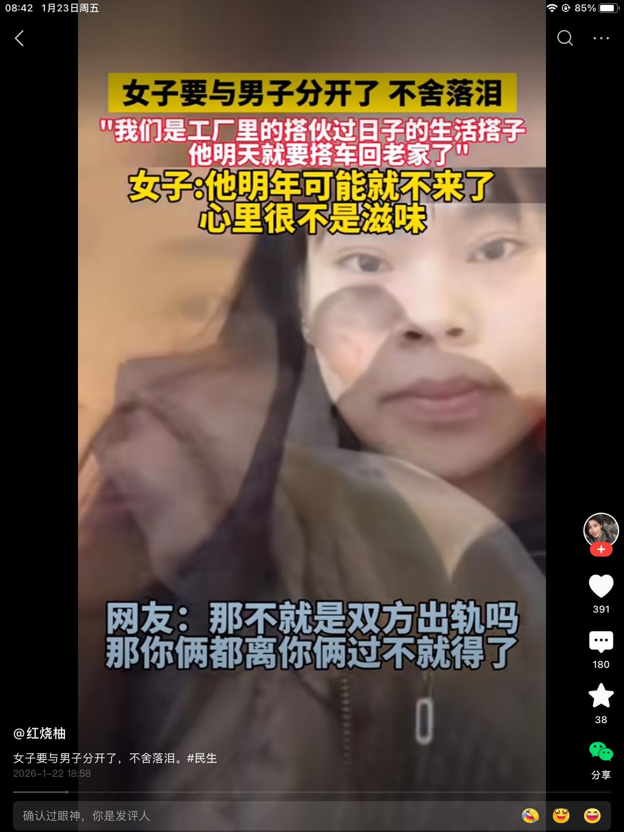 年底了,合伙搭子要回家了,女生有些不舍。不知他俩互相之外还有没有伴侣。我猜女生没有,男生有。不然,为啥男生不露脸呢? 还让我好奇的是,男人在外面有一个合伙人搭子,一年的时间,给这个女人花多少钱,花多了自己承受的住吗?话少了,她乐意吗?在外面辛苦一年,如果拿不回去钱,又咋说呢?看他俩的神态和背影,感觉都不是大手大脚的人。 如果各取所需,是不是人生也是一段自在美好的时光。其实我不知道答案。