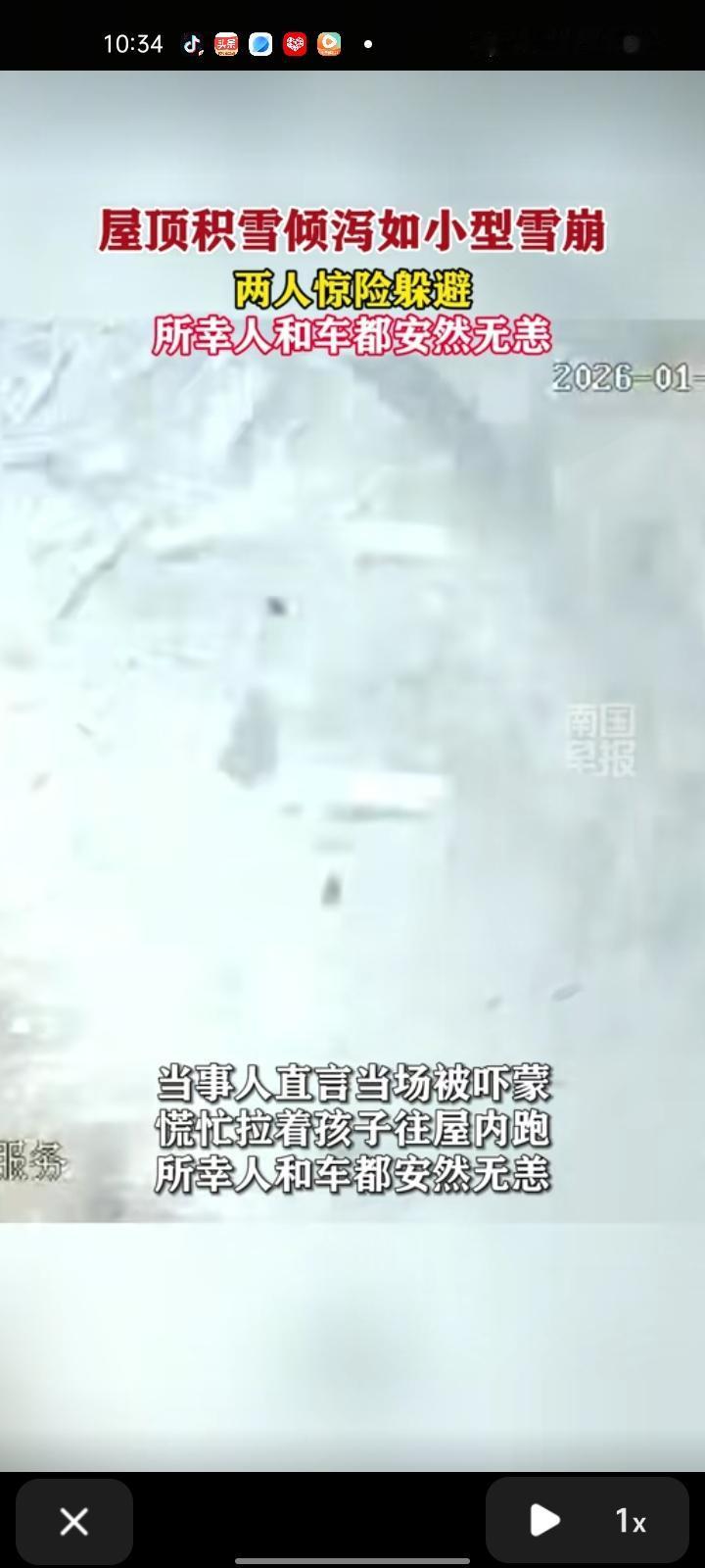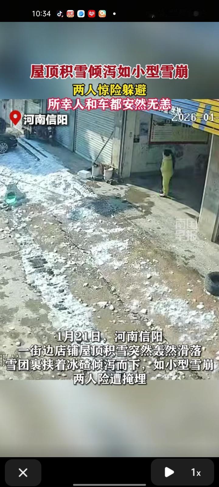 1月21日,信阳市固始县。一街边店铺屋顶积雪轰然滑落,雪团裹挟着冰碴倾泻而下,如小型雪崩,两人险遭掩埋。当事人直言当场被吓懵,慌忙拉着孩子往屋内跑,所幸人和车都安然无恙。