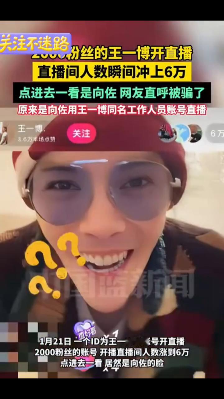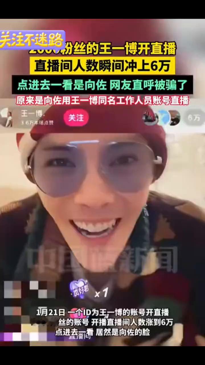 粉丝的王一博开直播,直播间人数瞬间冲上6万。 点进去一看是向佐,网友直呼被骗了。原来是向佐用王一博同名工作人员账号直播,1月21日一个ID为王一博的账号开直播,2000粉丝的账号开播,直播间人数涨到6万。点进去一看居然是向佐的脸,我昨天就这样被骗了进去。 向佐团队一名工作人员叫"王一博",此前在综艺中向佐称对王一博有"陌生又熟悉"之感。