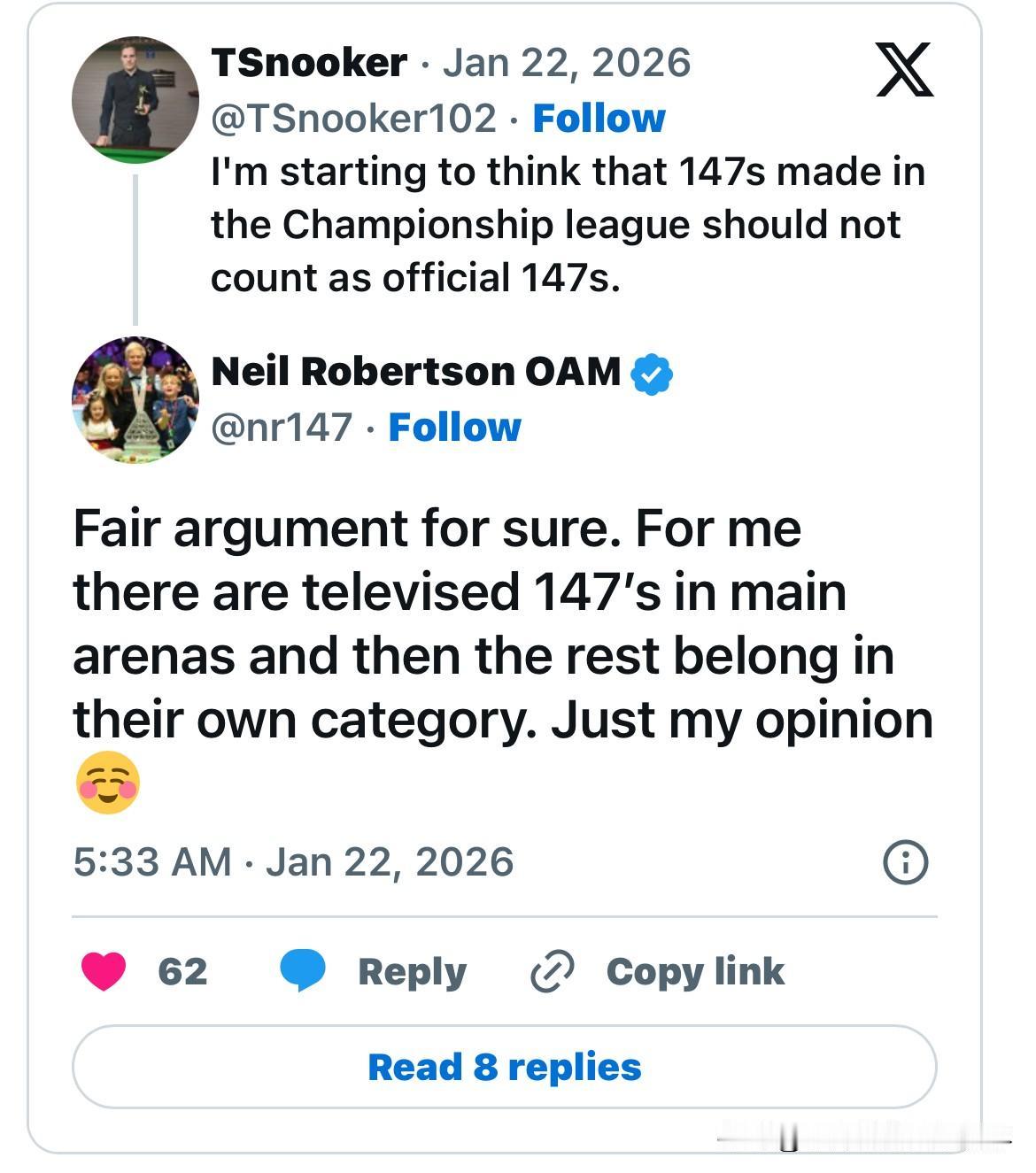 最近肖国栋、吴宜泽和赵心童先后在冠军联赛上打出147,但这并没有成为国外媒体头条热文,引发的更多是网友的质疑。 其中有一位网友在社交媒体上表示:“我开始觉得冠军联赛中打出的147分不应该被计入官方147分。” 而更加重磅的是尼尔-罗伯逊居然也加入其中,他留言表示赞同之余还说应该要分类统计。 罗伯逊说:“这确实是个有道理的观点,在我看来只有那些在主场馆电视直播中打出的147分才算数,其余的应该单独归类,这只是我的个人意见。” 在这个数据井喷的年代,147似乎不再是衡量顶尖高手和普通人的标准,越来越多人开始崇尚进攻,这使得147变得“廉价”的同时也让斯诺克失去了“博弈”的味道,大家同意罗伯逊的观点吗?