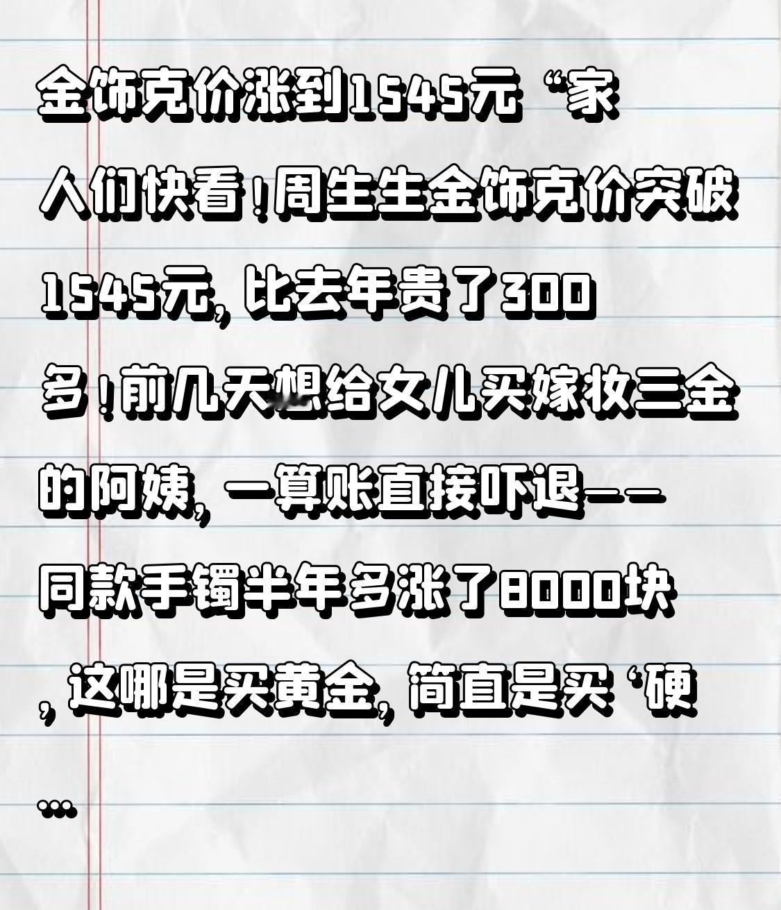 金饰克价涨到1545元 “家人们快看!周生生金饰克价突破1545元,比去年贵