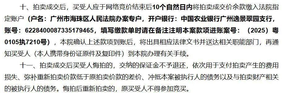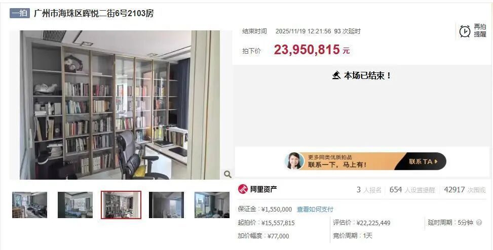【#买法拍房悔拍损失155万元保证金# 平台:保证金不会退,其也不得再次参加竞买】#买家2395万买法拍房悔拍损失155万# 近日,广州市海珠区保利天悦小区一套199余平方米的房产法拍,最终被拍出2395万元高价,单价达12万元/㎡,结果买家因没交余款悔拍,法拍平台称155万元保证金不会退。1月23日,极目新闻记者在阿里法拍平台看到,该住宅已重新挂拍。法拍公告称,该房产位于广州市海珠区晖悦二街保利天悦小区,建筑面积199.2334平方米,评估价22225449元,起拍价15557815元,保证金1550000元,由广州市海珠区人民法院挂拍,2025年11月19日正式开拍。法拍平台显示,当时有3人参与竞价,最后经93次叫价,一名邱姓买家以最高应价23950815元胜出。该交易价格超出评估价1725366元,单价达12万元/平方米。评估公司对该房产的估价为101021元/平方米。极目新闻记者查询到,该小区二手市场均价为10万元/平方米左右。按平台规则,拍卖成交后,买受人应于网络竞价结束后10个自然日内将拍卖成交价余款缴入法院指定账户。今年1月16日,平台发布最新情况说明,称该标的物于2026年1月16日确定交易未履行,具体情况及后续安排可咨询广州市海珠区人民法院。1月23日,极目新闻记者在法拍平台看到,该处房产被海珠区人民法院再次挂拍,起拍价和上次拍卖一样为15557815元,保证金也是1550000元,将在2月25日正式开拍。目前没人报名。记者拨通法拍平台的咨询电话,一工作人员称,该处房产因受买人没有交齐尾款悔拍才再次挂拍,跟房子本身没有关系,是因对方个人资金问题,这个房子他不要了,他的155万元保证金将不会退还。记者在平台上看到,广东省广州市海珠区人民法院发布的竞买须知中规定:买受人应于网络竞价结束后10个自然日内将拍卖成交价余款缴入法院指定账户。拍卖成交后买受人悔拍的,交纳的保证金不予退还,依次用于支付拍卖产生的费用损失、弥补重新拍卖价款低于原拍卖价款的差价、冲抵本案被执行人的债务以及与拍卖财产相关的被执行人的债务。悔拍后重新拍卖的,原买受人不得参加竞买。法院还特别提醒,竞买人在拍卖竞价前请务必再仔细阅读法院发布的竞买须知及拍卖标的调查情况表。(极目新闻)