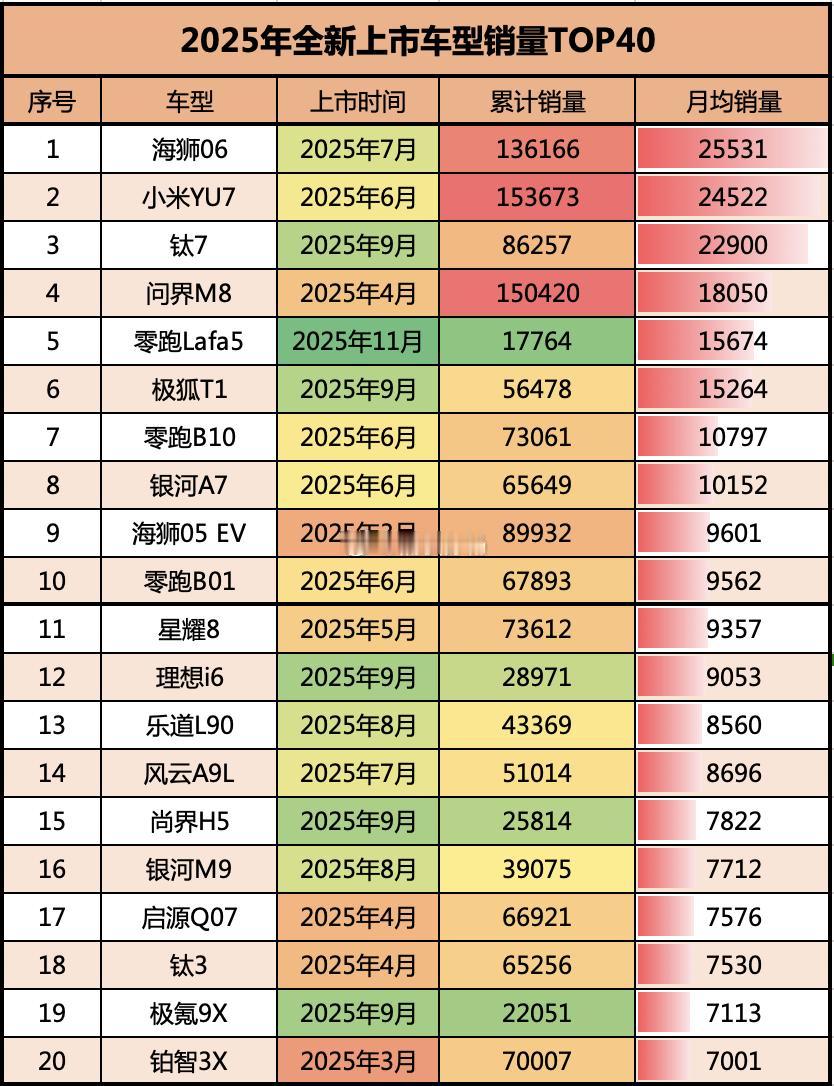 2025年全新上市车型排行榜,比亚迪海狮06以月均销量榜首稳坐第一名,小米YU7与方程豹钛7紧随其后。大家怎么看待这个排行榜,在汽车市场下行的2025年,单月销量持续突破两万以上的车型大家觉得怎样?