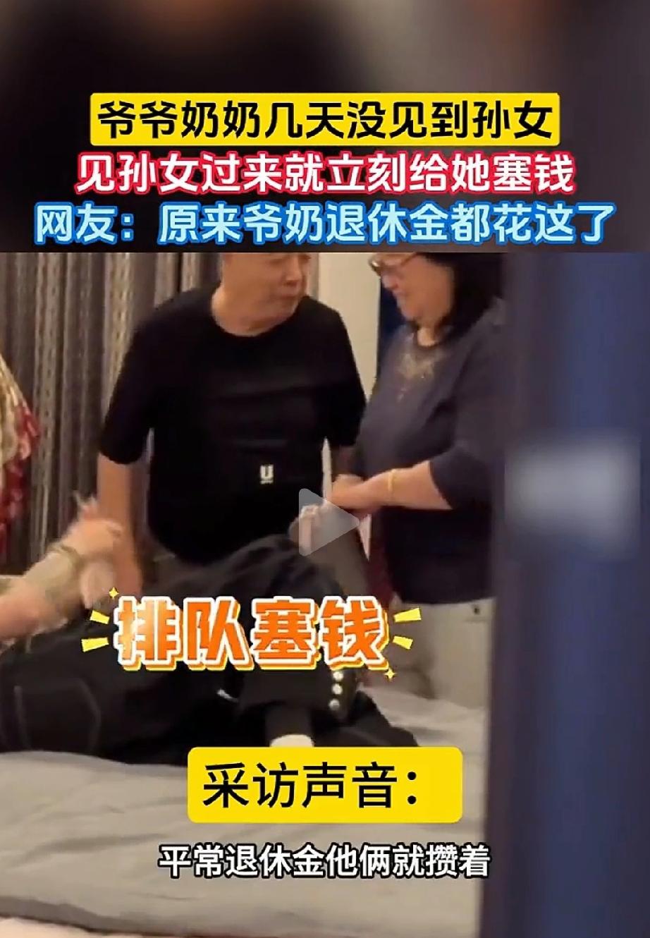 这真是有钱人宠孩子的方式啊!孙女周末去爷爷奶奶家,吃完晚饭后躺在床上玩手机,突然爷爷先掏出几千元现金当零花钱,奶奶随后也递来几千元,而给钱的人甚至比收钱的人还高兴。网友:隔辈亲,就是不一样 视频里,晚饭后孙女趴在床上翘着脚,悠闲地玩着手机,完全没料到惊喜会突然到来。爷爷先走到床边,从兜里掏出厚厚的一沓现金,笑着递给孙女,孙女收下后满脸欢喜。 这还不算完,没多久奶奶也拎着包走过来,同样掏出几千块钱塞给孙女,老两口看着孙女,脸上满是笑意,比自己收到东西还开心。 据家里人说,这可不是老两口第一次这么做,他们平时对自己特别抠,退休金省吃俭用攒着,却总隔段时间就给孙子孙女塞三五千的零花钱,早就成了家常便饭。 老人一辈子攒的钱,自己舍不得吃穿,全心甘情愿给了孩子。这哪是给钱啊!这是爷爷奶奶把满满的爱揉进了现金里! 他们那代人不会说华丽的情话,只会用最实在的方式疼孩子,自己省吃俭用,却把最好的都留给孙辈,这份毫无保留的爱,真的太戳心了。 而且孙女腼腆的样子,也能看出她懂感恩,这份双向的温暖,才最动人。就如网友说的“这就是刻在骨子里的隔辈亲,一点道理都不讲!” 爷爷奶奶给钱,从不是为了让孩子挥霍,而是想借着这份实在的心意,告诉孩子“有我们在,你不用委屈”,是想留住“我还能为你做点什么”的安心。 这种爱,笨拙又朴实,却重如泰山。它从来不是嘴上说说,而是藏在每次偷偷塞给你的零花钱里,藏在给你留的满满一碗肉和蛋的面里。 我们有时候会觉得,老人这样会不会太惯着孩子?但其实,视频里的孙女收到钱时,笑容腼腆,满是感激。爱的给予和接收,本身不就是一种幸福吗? 这份“隔辈亲”,是爱的自然延续。它从父母那里传下来,又加倍地倾注到了孙辈身上。对于我们晚辈来说,最好的回报或许不是拒绝这份沉甸甸的心意,而是真诚地收下,并把它用在正处,时常告诉牵挂你的老人:“我过得挺好,你们放心吧。” 爷爷奶奶几天没见孙女 见面就塞钱