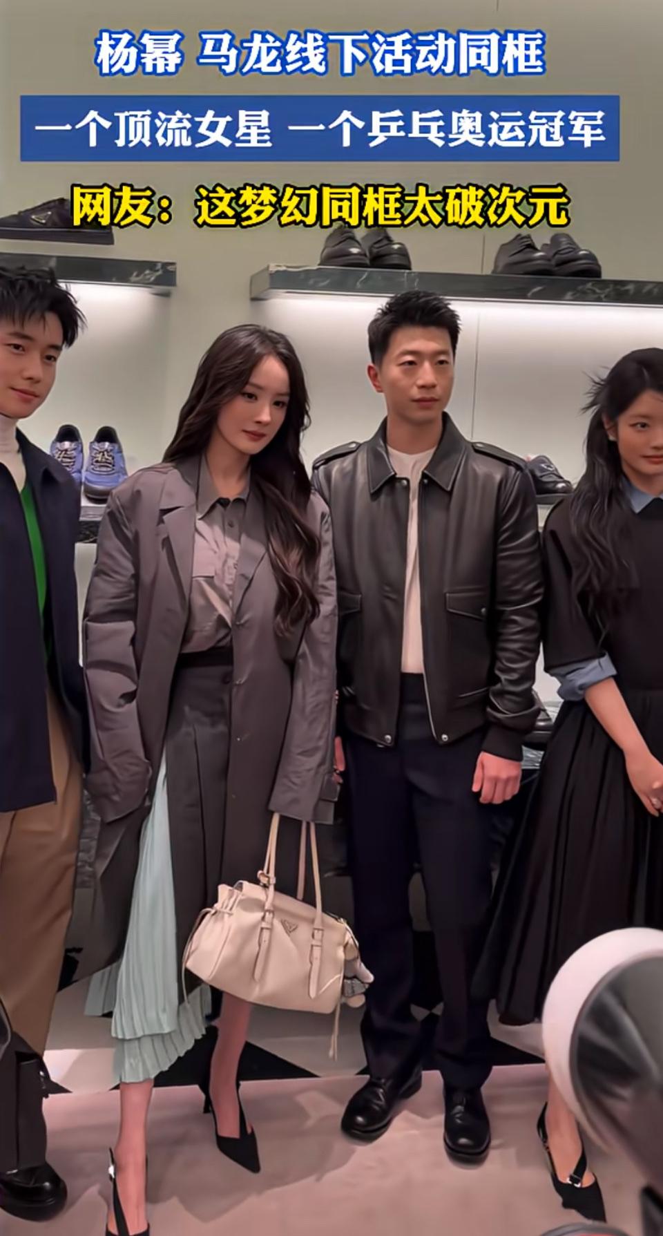 杨幂和马龙同框,简直破次元壁了!1月22日,先是有人在上海普通餐厅偶遇他们同框干饭,下午又一起亮相Prada赤马年活动。赛场上横扫千军的马龙,见到偶像杨幂耳朵通红、呲牙笑,从跨年晚会搓手紧张到聚餐从容热聊,追星售后太甜。 活动现场,杨幂双手冻红、礼服有褶皱,却凭真实感圈粉,骨相抗打、气场十足;马龙亮色造型,挺拔身姿气场全开,手背上青筋成了特别的时尚印记;徐若晗蓝色裙装清新灵动。褪去光环的他们,互相欣赏,在各自赛道做到极致,这才是同框最动人之处。 这一场奇妙的同框,让大家看到了明星们私下鲜活的一面。马龙这位体坛王者,平时在赛场上专注冷静,却在面对杨幂时流露出了可爱的小粉丝模样,这种反差萌着实让人觉得有趣。而杨幂,即便双手冻红、礼服有褶皱,也丝毫不影响她的魅力,她的真实就像一股清流,让粉丝们感受到了她不被光环束缚的一面。 徐若晗的蓝色裙装在活动中也十分亮眼,清新灵动的她仿佛带着青春的气息,为这场活动增添了一抹别样的色彩。他们三人站在一起,就像不同领域的三颗闪耀星辰汇聚一堂,每一个人都在自己的世界里发光发热。 这次同框也让网友们纷纷感叹,原来优秀的人无论在哪个领域,都能相互吸引。马龙在赛场上不断挑战自我,追求卓越;杨幂在演艺界塑造了一个个经典的角色;徐若晗也在演艺道路上努力前行。他们用自己的行动诠释着对梦想的执着和热爱,这种精神也激励着无数人在自己的赛道上奋勇拼搏。希望未来他们能继续在各自的领域创造更多的精彩,也期待能有更多这样破次元壁的同框出现。
