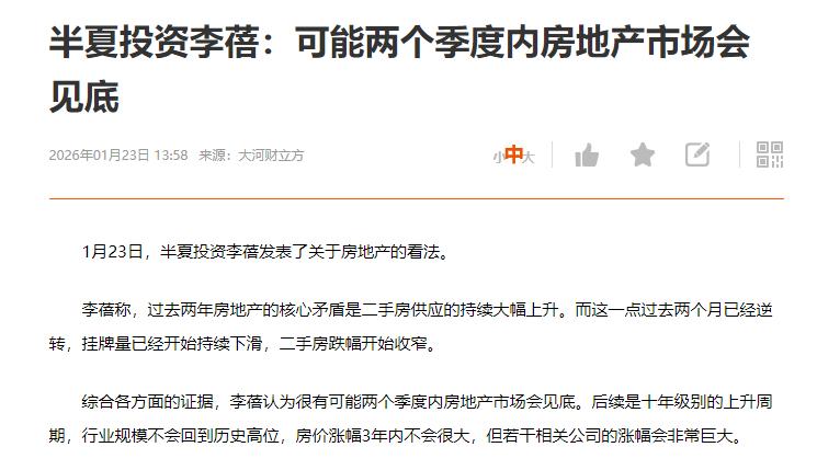 蓓姐说两个季度之内房地产见底。这玩意也不知道是怎么研究出来的。 怎么是两个季度,为什么不是两年呢?以蓓姐的理解力,如果不坚持地产,研究科技大概率会有一番作为的,沉迷于传统增长模式不能自拔。。