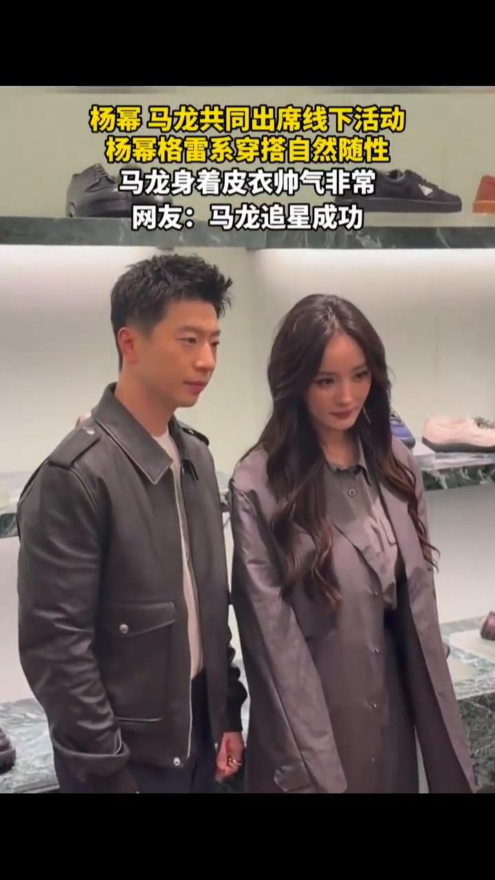 杨幂马龙共同出席线下活动,杨幂格雷系穿搭自然随性,马龙身着皮衣帅气非常。 网友: