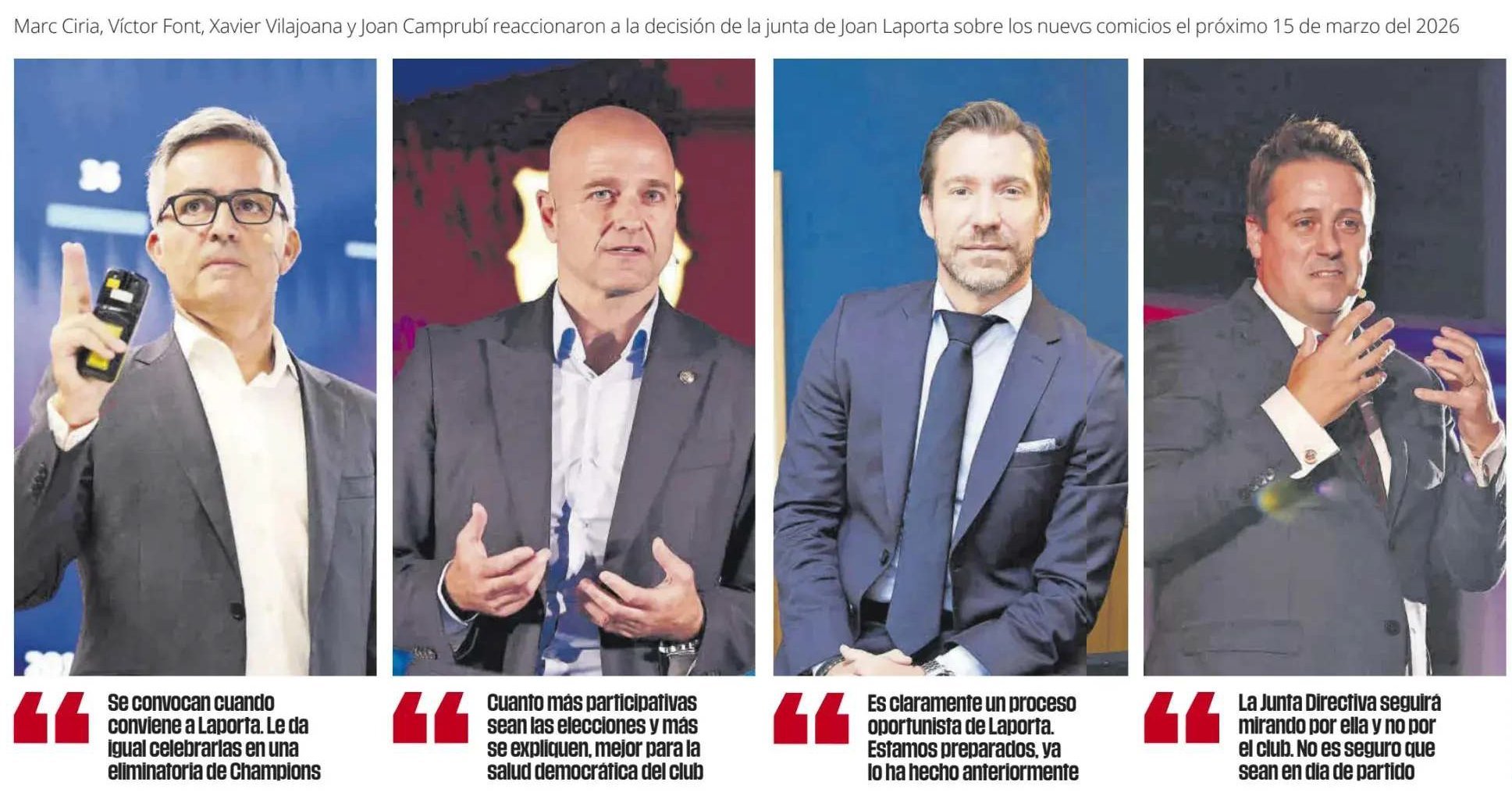 世体:拉波尔塔宣布3月15号大选后,巴塞罗那足球俱乐部主席候选人就选举日期发表评论: 维克托·丰特:“拉波尔塔想什么时候举行选举就什么时候举行。他根本不在乎选举是否在欧冠淘汰赛期间举行。” 哈维·维拉胡阿纳:“选举的参与度越高,解释得越清楚,对俱乐部的民主健康就越有利。” 马克·塞里亚:“这显然是拉波尔塔的投机之举。我们已经做好准备,他以前也这么做过。” 琼·坎布罗比:“董事会将继续维护自身利益,而不是俱乐部的利益。我们甚至不确定选举是否会在比赛日举行。”欧冠联赛巴萨至死不渝红蓝魂