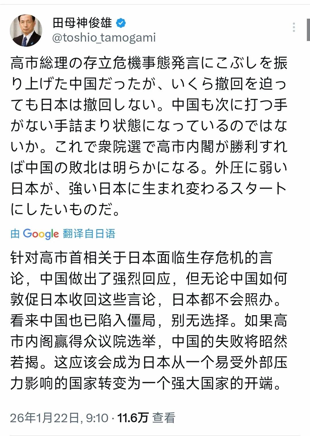 日本高官叫嚣:高市若胜,中国必输,日本将成强大国家 外界评价如今的日本“正在飞速走上二战前老路”,绝对不是危言耸听。当地时间22日,日本极右翼政客、前日本航空自卫队一把手田母神俊雄,在社媒公然发文叫嚣称,无论中方如何抗议,日本都不会收回高市早苗的涉台错误言论,这让中国“陷入了僵局”。他还声称,如果高市带领自民党赢下众议院选举,那中国就必将失败,日本也将借此成为“强大国家”。 这已不是他首次大放厥词:去年12月,他就在社交媒体上宣称珍珠港事件是美国对日本的“栽赃抹黑”,获得近60万阅读量。2008年,他还因发表《日本曾是侵略国家吗?》一文被解除空自幕僚长职务,文中他公然声称“日本是被蒋介石拖入战争中的受害者”、“珍珠港事件是美国的陷阱”。 同时,他还长期否认侵略历史,美化殖民统治,宣称日本在朝鲜半岛的统治“使当地人从暴政中解放出来”,还公开支持日本拥有核武器。种种言论,与高市的错误言论形成呼应,构成日本右翼系统性挑战战后国际秩序的危险合流。 不过,这种“高市若胜,中国必输”的言论,只是螳臂当车的政治呓语,反映出的,正是日本右翼势力的极端民族主义妄想,以及对日本国情和国际形势的严重误判。 首先,真正“陷入僵局”的不是中国,而是日本自身。随着中方反制措施持续发力,日本经济界压力增大,民众已开始抱怨“比起扩军,我们更需要民生保障”。显然,若高市内阁一意孤行,最终承受损失的只会是日本自己。 其次,那句“日本将从此成为强大国家”,也正是军国主义思想复苏的直接体现。这些右翼分子沉浸在虚幻的“胜利幻觉”中,以为中国还是80多年前的那个积贫积弱的国家,打败了中国,日本就能成为强大国家,这与当年的所谓“大中亚共荣圈”,完全是同样的逻辑。 历史已经并将继续证明,玩火者必自取灭亡,日本若继续在危险道路上狂飙,不仅将耗尽中日关系的最后一点互信,更将让自身陷入万劫不复的地缘政治深渊。