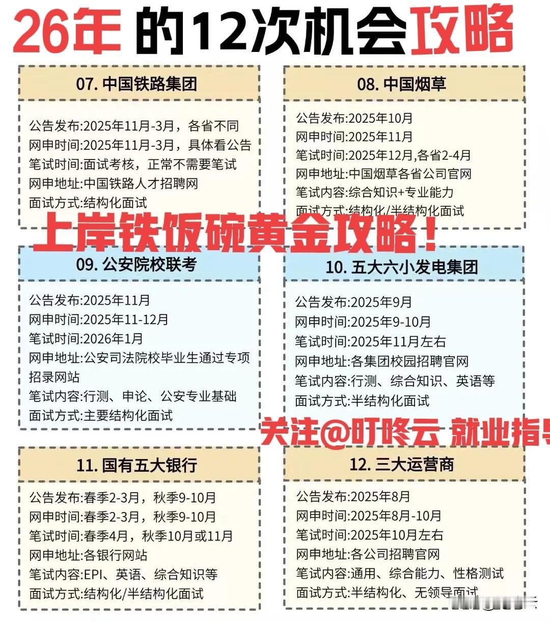 黄金攻略!26年上岸铁饭碗的12次机会汇总揭秘!最全盘点,一图概览,速速收藏起来!国家公务员、省考公务员、选调生、国家电网、文职人员等等好机会。参考25年的报名时间,笔试时间。速速围观揭秘详细内容![点亮平安灯][点亮平安灯][烟花][烟花] 关注@叮咚云—将持续为你分享最有价值的行业洞察,提供志愿填报、就业咨询、职业规划经验指导![来看我][比心][比心] 免责声明:图片来自网络,仅供参考!