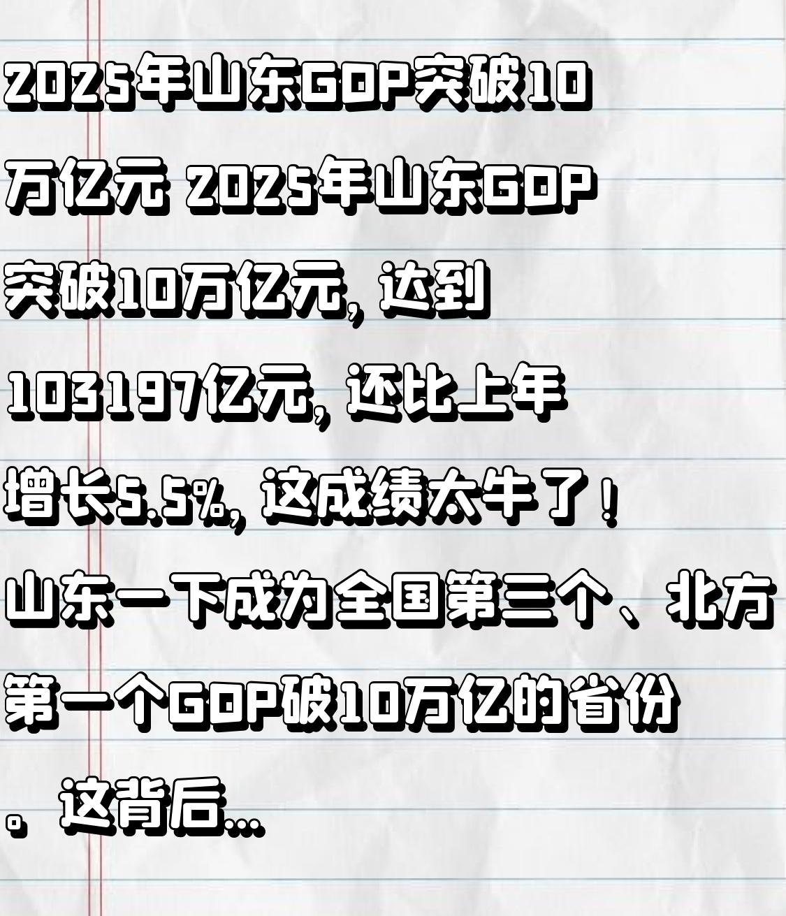 2025年山东GDP突破10万亿元 2025年山东GDP突破10万亿元,达到103197亿元,还比上年增长5.5%,这成绩太牛了!山东一下成为全国第三个、北方第一个GDP破10万亿的省份。 这背后肯定是山东这些年不断努力的结果。像山东有很多传统产业在升级,新兴产业也在崛起,工业、农业都发展得不错。有这么亮眼的成果,未来山东肯定会发展得更好,说不定还能带动周边地区一起进步,让北方经济更上一层楼!