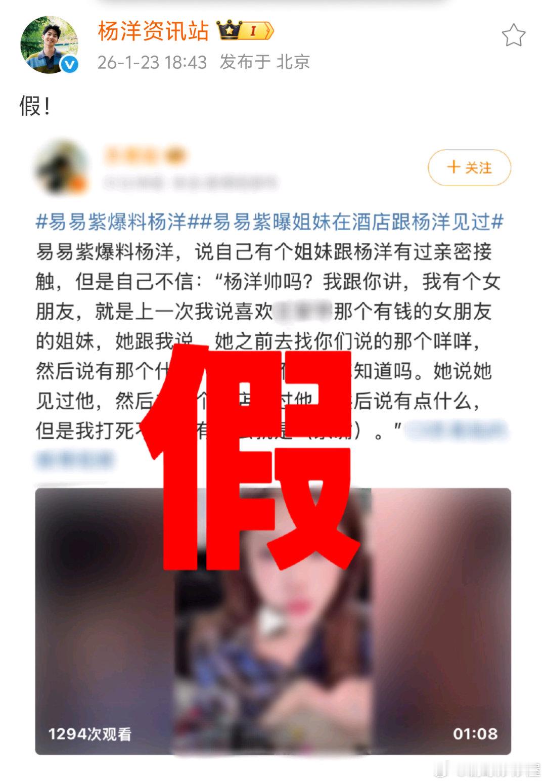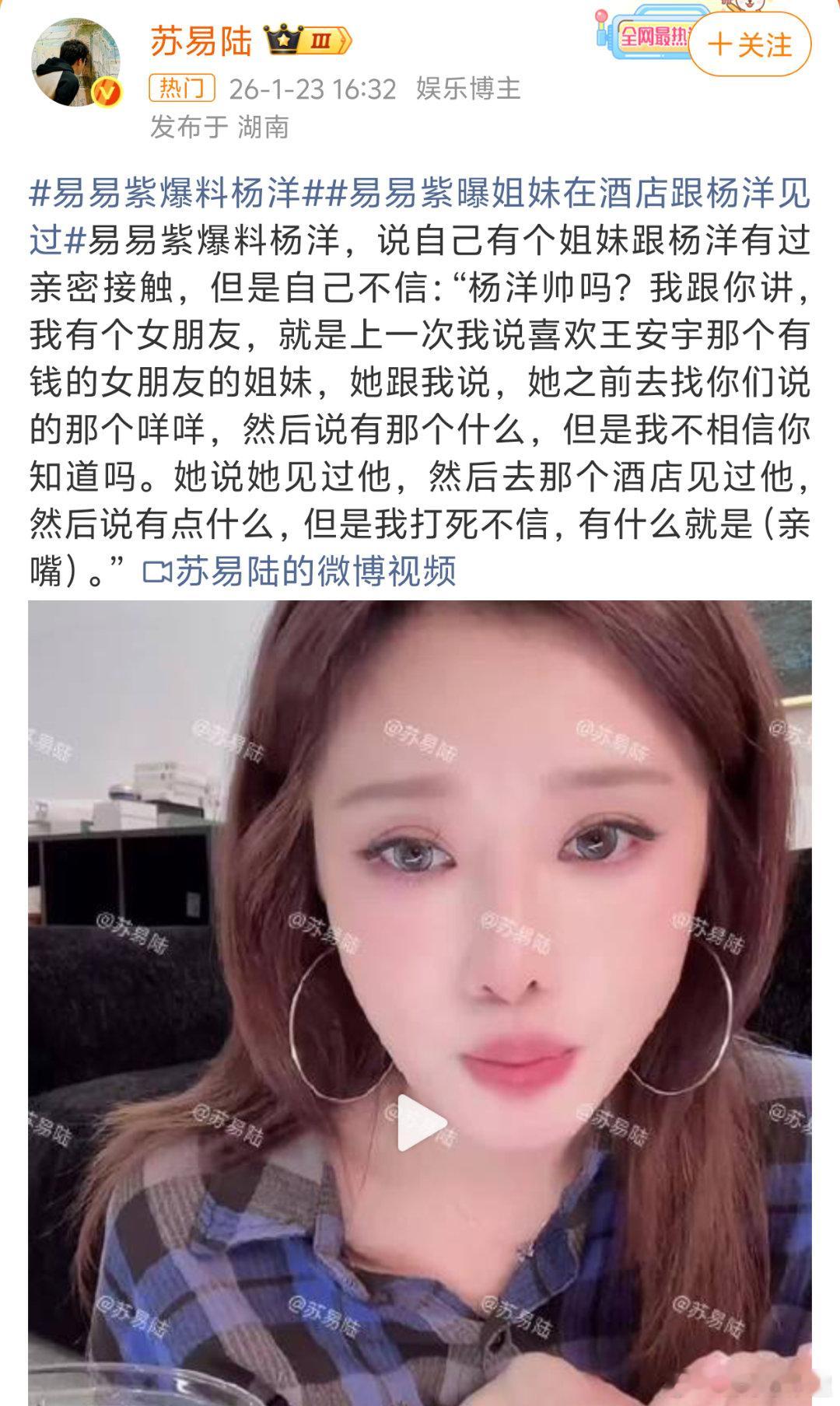 杨洋方回应易易紫爆料姐妹曾在酒店见过杨洋,还有点什么……没照片没视频没证据要么文字要么一张嘴,现在都流行这样起号吗?zy一张嘴辟谣跑断腿啊易易紫爆料杨洋