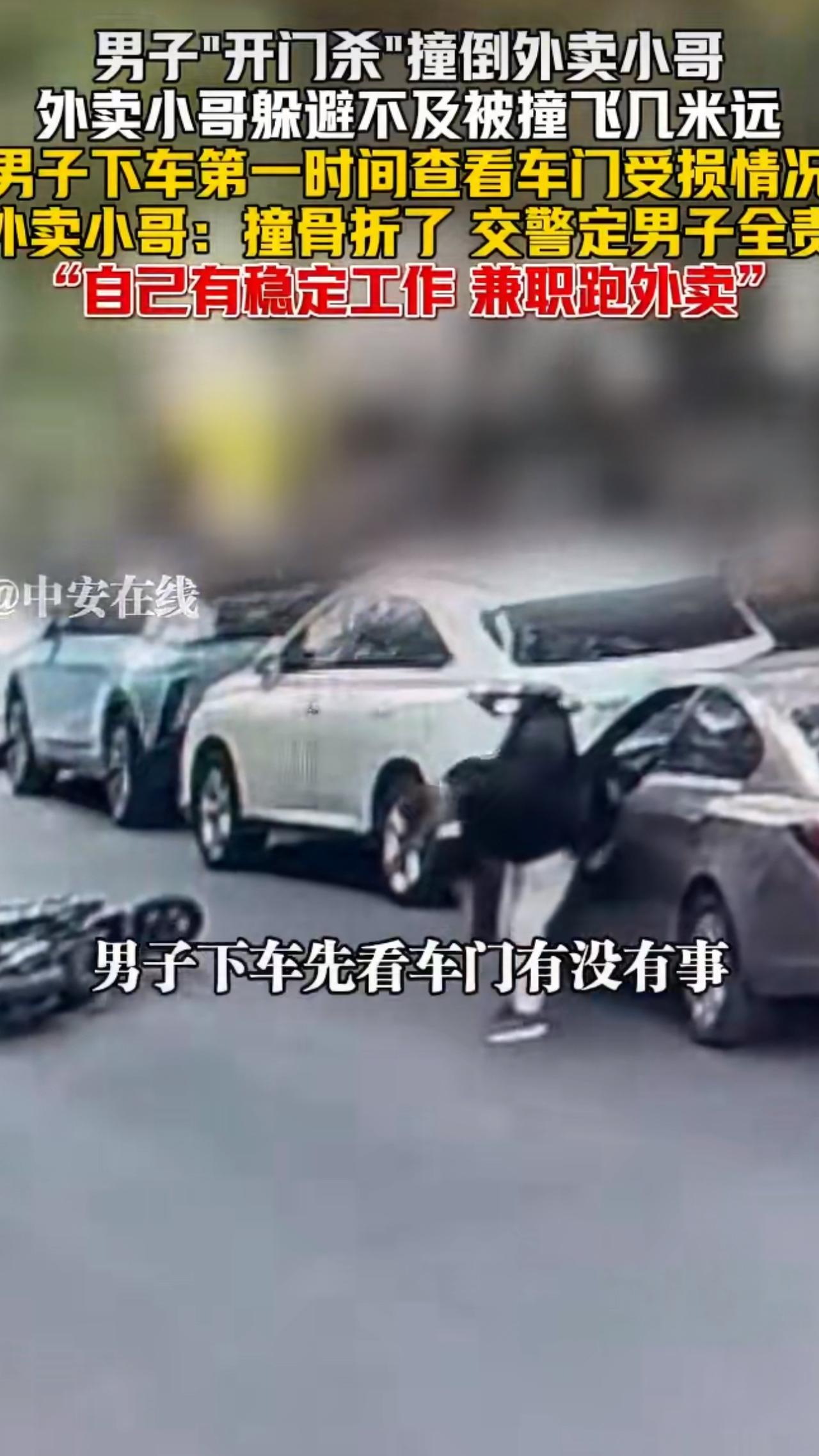 有个热点事件,说的是一位司机在路边停车后开门,结果把一位外卖小哥给撞飞了,更让人气愤的是,撞人后司机下车第一时间不是去查看外卖小哥的伤势,而是先检查自己的车门有没有受损。这事儿一出来,网友们可炸开了锅,纷纷指责这位司机的行为太冷漠,太不负责任。 咱们先来还原一下事情的经过,那天,外卖小哥正骑着电动车在非机动车道上正常行驶,突然,路边一辆停着的车车门猛地打开,外卖小哥根本来不及反应,就被撞得飞了出去,重重地摔在地上,电动车上的外卖也撒了一地,现场一片狼藉,外卖小哥疼得捂着腿,表情十分痛苦,而这时,车门打开,司机下车后,竟然先去查看自己的车门,确认没有损坏后,才慢悠悠地走到外卖小哥身边,这一幕,被路过的市民用手机拍了下来,发到了网上,很快就引起了大家的关注,网友们看到这段视频后,纷纷表示愤怒和不解,大家觉得,不管车门有没有坏,撞了人第一反应应该是关心伤者,而不是先看自己的车门。这种冷漠的态度,实在让人难以接受。还有网友说,这位司机可能觉得外卖小哥没什么大碍,或者觉得自己有理,所以才这么淡定,但不管怎样,撞了人就应该先道歉,先关心伤者,这是最基本的道德和法律常识。 其实,“开门杀”这种事故并不少见,很多时候,都是因为司机或者乘客在下车前没有仔细观察周围情况,就贸然打开车门,结果导致后方来车避让不及,发生碰撞,这种事故往往后果严重,因为非机动车和行人的防护措施相对较弱,一旦被撞,很容易受伤。就像之前有个案例,一位乘客在出租车后排突然开门,结果把一辆正常行驶的电动车撞倒,骑车人受伤严重,最终因为伤势过重抢救无效死亡。这样的悲剧,让人痛心不已。所以,咱们开车或者坐车的时候,一定要养成好习惯。下车前,先通过后视镜观察后方情况,确认没有来车或者行人后,再慢慢打开车门,而且,最好用离车门较远的那只手去开门,这样身体会自然转动,更容易观察到后方情况,另外,司机也有责任提醒乘客注意安全,特别是在路边停车下客的时候,一定要确保安全后再让乘客下车。外卖事故 开门杀撞飞外卖员后先看车门 开门杀 事件来源:中安在线