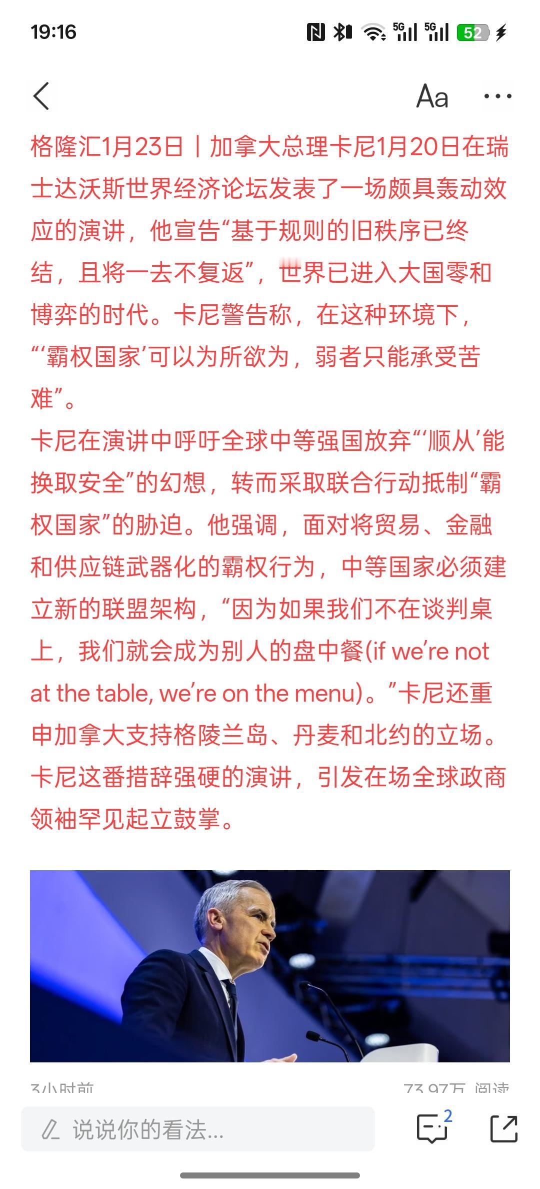 加拿大要开始反美霸权呢!外交政策重大转变?加拿大卡尼:旧秩序已死,顺从换不来安全,中等强国应联合抵制霸权!这一次,加拿大非常的强硬,而且在格陵兰岛问题上面,他是强烈支持格陵兰岛支持北约,而且支持丹麦的立场! 美国持续对加拿大进行施压的过程,让加拿大开始逐渐的清醒认识到美国的霸权!其实加拿大算是美国的重要盟友!但就是因为是盟友,所以美国对加拿大有了想吞并的想法! 加拿大非常明白,如果我们不能在谈判桌上进行谈判,那只能是谈判桌上餐桌上的别人的菜,是别人口中的盘中餐! 这一次来中国访问过后,突然间就强硬了!