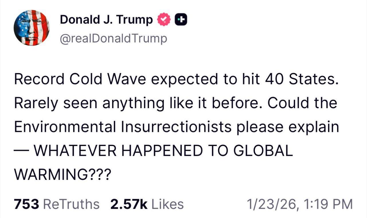 特朗普通过 Truth Social 发文称:预计创纪录的寒潮将袭击 40 个州。以前从未见过如此极端的情况。那些环保暴乱分子能否解释一下——全球变暖到底去哪儿了???海外新鲜事热点现场国际局势