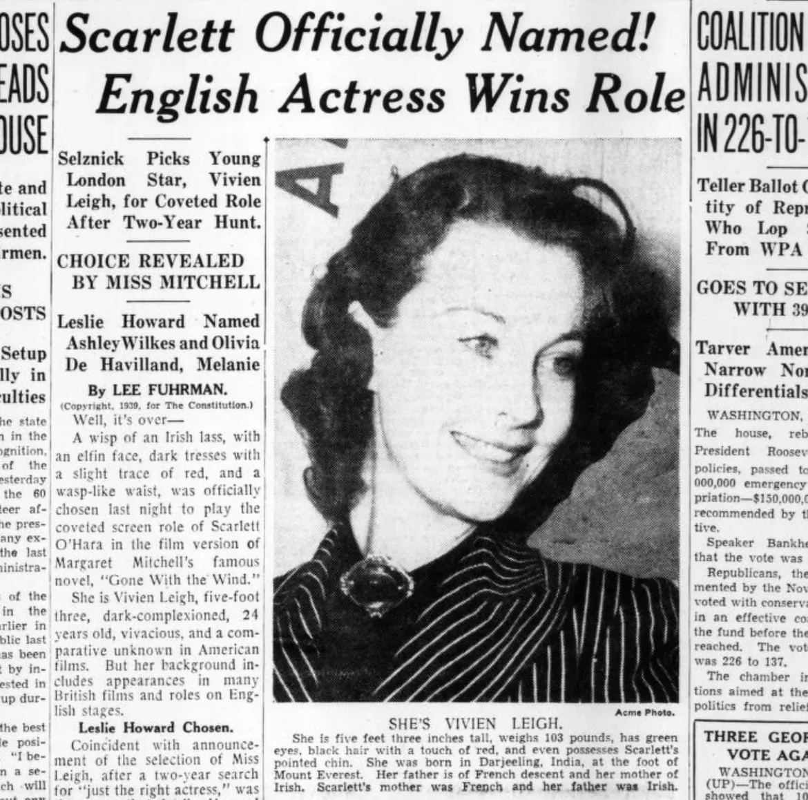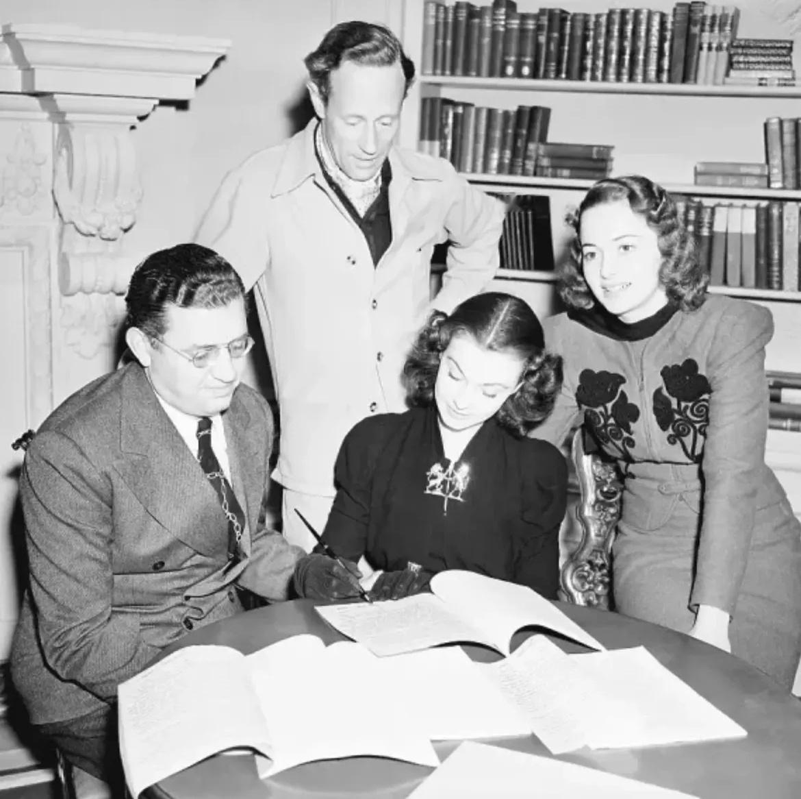 【来自投稿】图一 1939年1月13日 《乱世佳人》的电影制片人大卫·塞尔兹尼克 和演员费雯丽,莱斯利·霍华德,奥利维亚·德·哈维兰 签演员合约 图二 《亚特兰大宪法报》 刊登英国青年女演员费雯丽得到了斯嘉丽这个角色