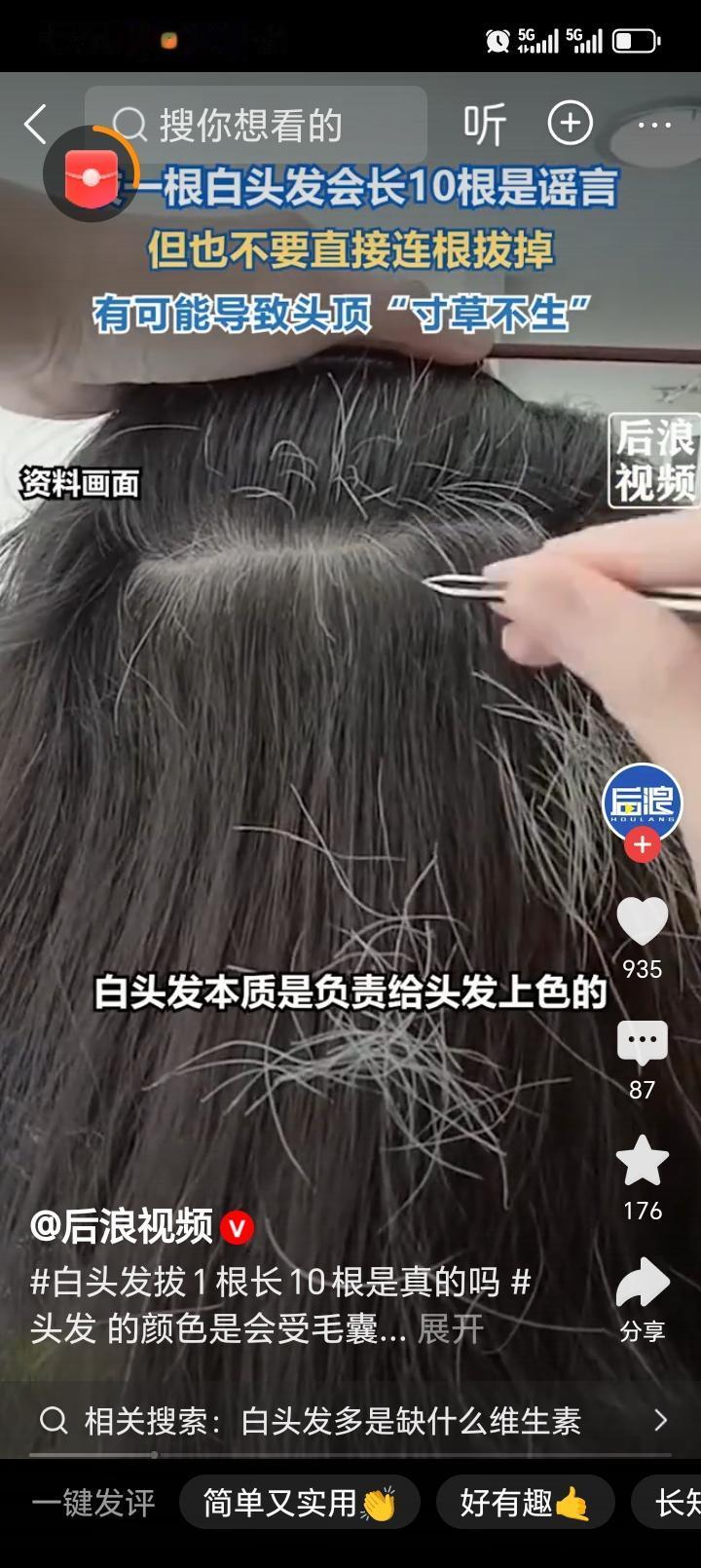白发拔1根长10根是真的吗? 白发拔一根真的会长出十根吗?这个问题一时间引发了不少人的好奇和猜测。很多人听说“拔一根白发会长十根”,于是纷纷尝试,期待着“奇迹”发生。然而,真相到底是什么?科学告诉我们,这个传言究竟靠不靠谱? 实际上,这个说法纯属谣言,没有任何科学依据。白发的生长机制和普通头发一样,是由毛囊决定的,每根头发都来自于独立的毛囊。拔掉一根白发,毛囊不会因此“变得更旺盛”或“长出十根新发”。相反,频繁拔白发可能会对毛囊造成伤害,甚至引发毛囊炎或造成永久性脱发。 那么,为什么会有“拔一根白发会长十根”的传言呢?其实,这是一种误解或迷信。有人认为拔掉白发后,新的白发会“变得更密集”,但实际上,白发的出现与遗传、年龄、身体状况有关,和拔白发没有直接关系。有时候,拔掉一根白发,可能会让旁边的白发看起来更密集,但这只是视觉上的错觉。 更深层次的问题在于,很多人对白发的焦虑和恐惧,让他们盲目相信各种“偏方”或“传说”。其实,白发是自然的生理现象,随着年龄增长,头发中的色素细胞逐渐减少,这是正常的衰老过程。我们无需过度担心,也不必盲目拔发,保持良好的生活习惯,合理饮食,心情愉快,才是健康长寿的关键。 所以,答案很明确:白发拔一根不会长出十根。这只是一个没有科学依据的谣言。面对白发,我们应理性对待,接受自然的变化,用正确的心态去面对岁月的痕迹。毕竟,真正的美丽,不在于头发的多少,而在于内心的自信和从容。让我们用科学的眼光看待生活中的每一个“传说”,远离迷信,迎接更健康、更积极的自己。白发问题