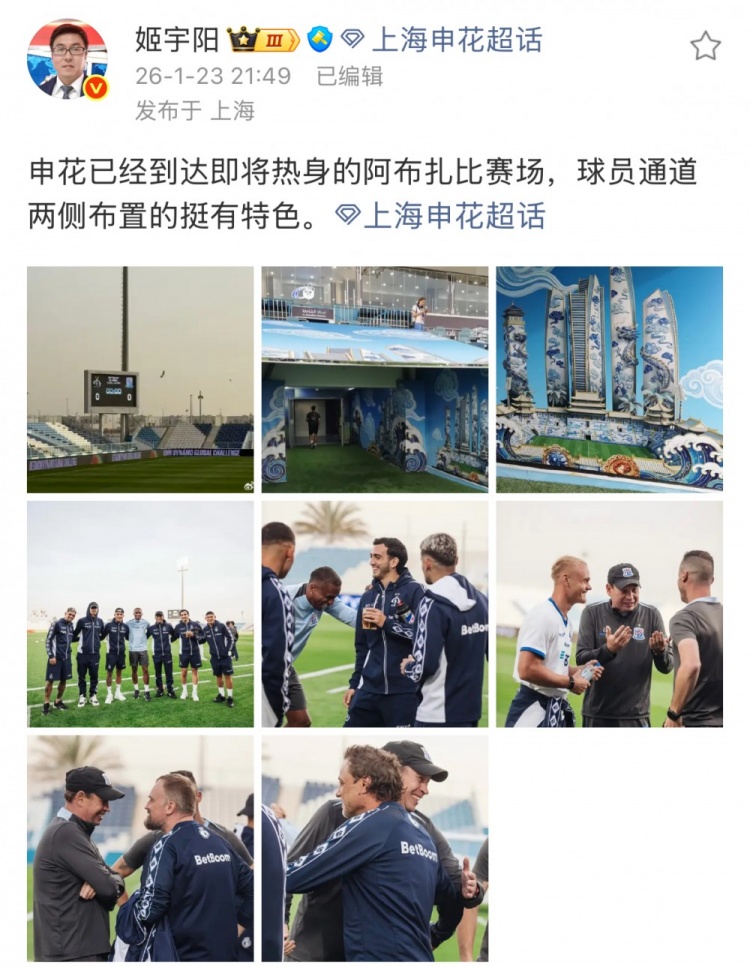 媒体人姬宇阳在社媒晒出了申花抵达热身赛场地的照片,以及申花主帅斯卢茨基和对方教练组寒暄的照片等,并配文写道:“申花已经到达即将热身的阿布扎比赛场,球员通道两侧布置的挺有特色。”