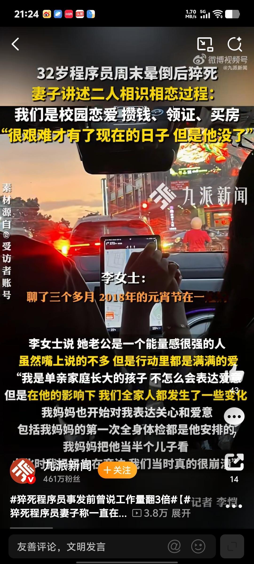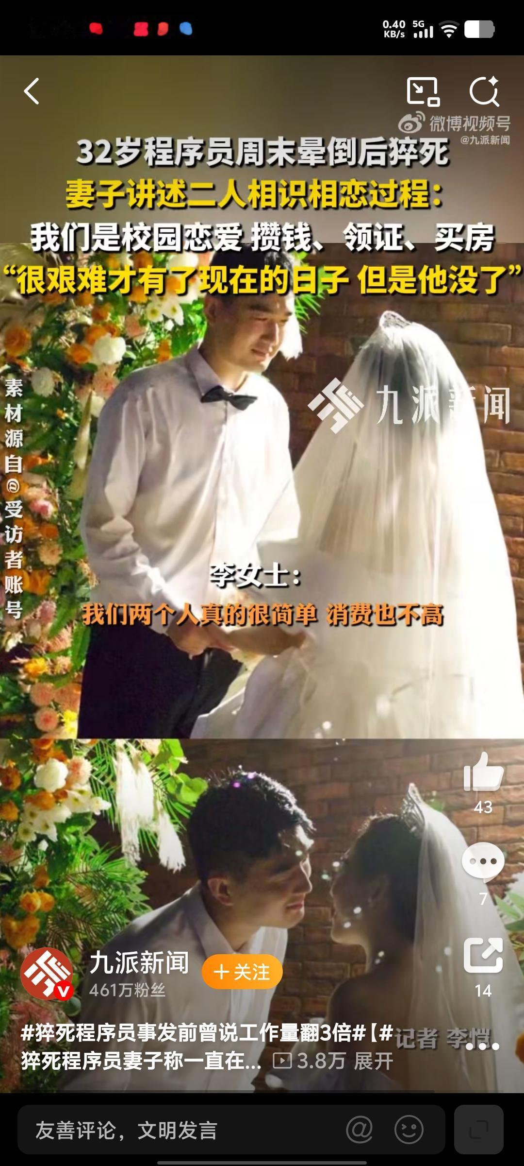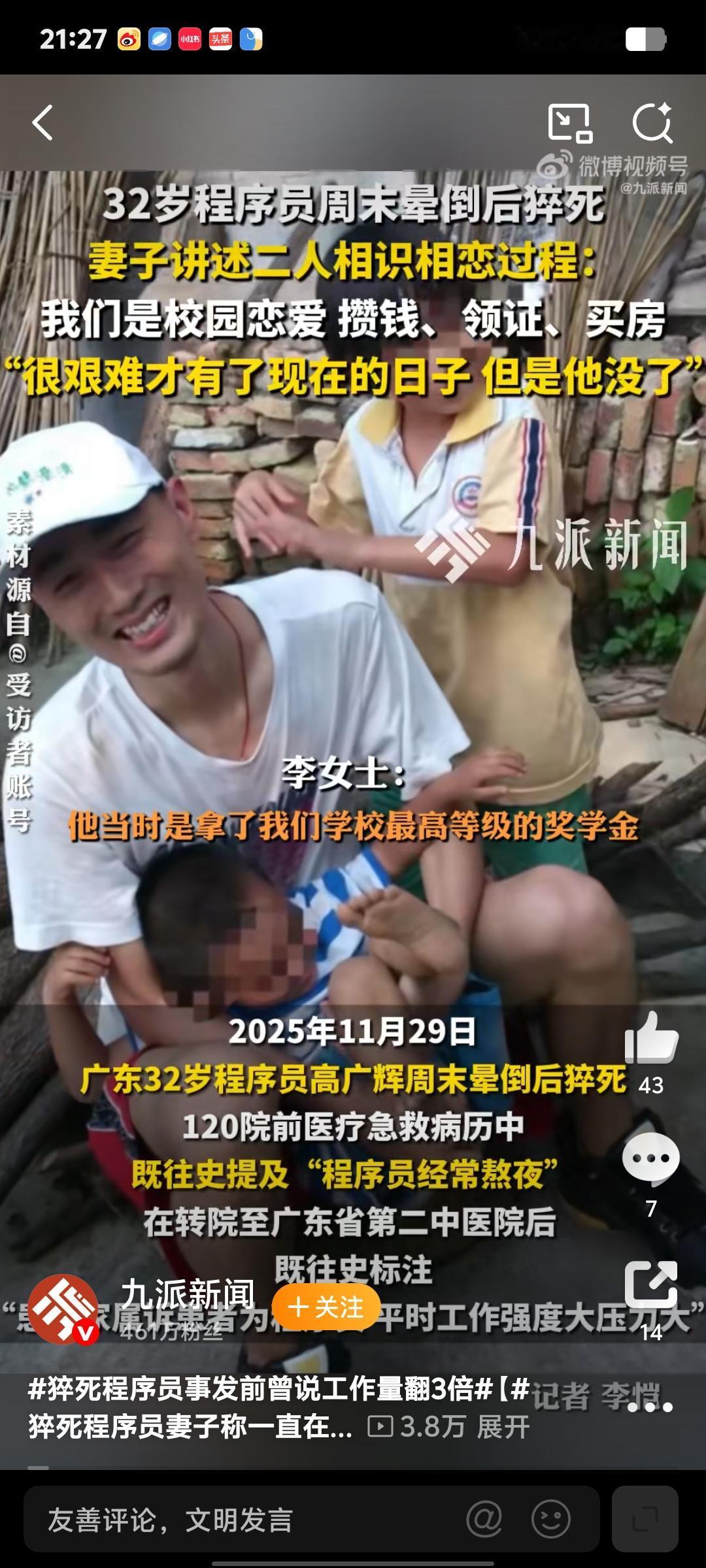 32岁猝死的程序员高广辉。当年在学校拿全额奖学金。妻子李女士很崇拜自己的老公。他俩交往了两年之后,白手起家,自己买房子,自己装修。 妻子说。丈夫非常的暖心。自己母亲的第一次体检都是他买的,丈母娘也拿他当亲儿子一样看待。 我他们的房子刚开始是一个月要还9000多。两个人都是程序员,后来多次提前还贷。 房贷降到六七千块一个月。李女士身体不好,后来被裁员,开始调养身体,备孕。 丈夫一个人为了这个小家全身心付出。周六在休息时间。也在用平板工作。 底薪只有3000,想多赚钱只能靠绩效。高先生晕倒之前还提醒妻子。带着笔记本去医院。 出事之前他在家就已经常睡不醒。每次闹钟都叫不起来,只能李女士人工叫醒,这就是过劳疲惫的表现。 现在妻子开始申请。工伤认定,希望会有一个好结果。这件事在网上也引起了无数牛马的共鸣。 程序员的生活实在是太卷了。休息的时间太少。这位英年早逝的高先生真是可惜了。 也希望这件事能给无数内卷的网友敲响警钟,身体才是革命的本钱。 钱可以少赚一点,但生命只有一次。希望大家都能爱惜自己的身体。高广辉