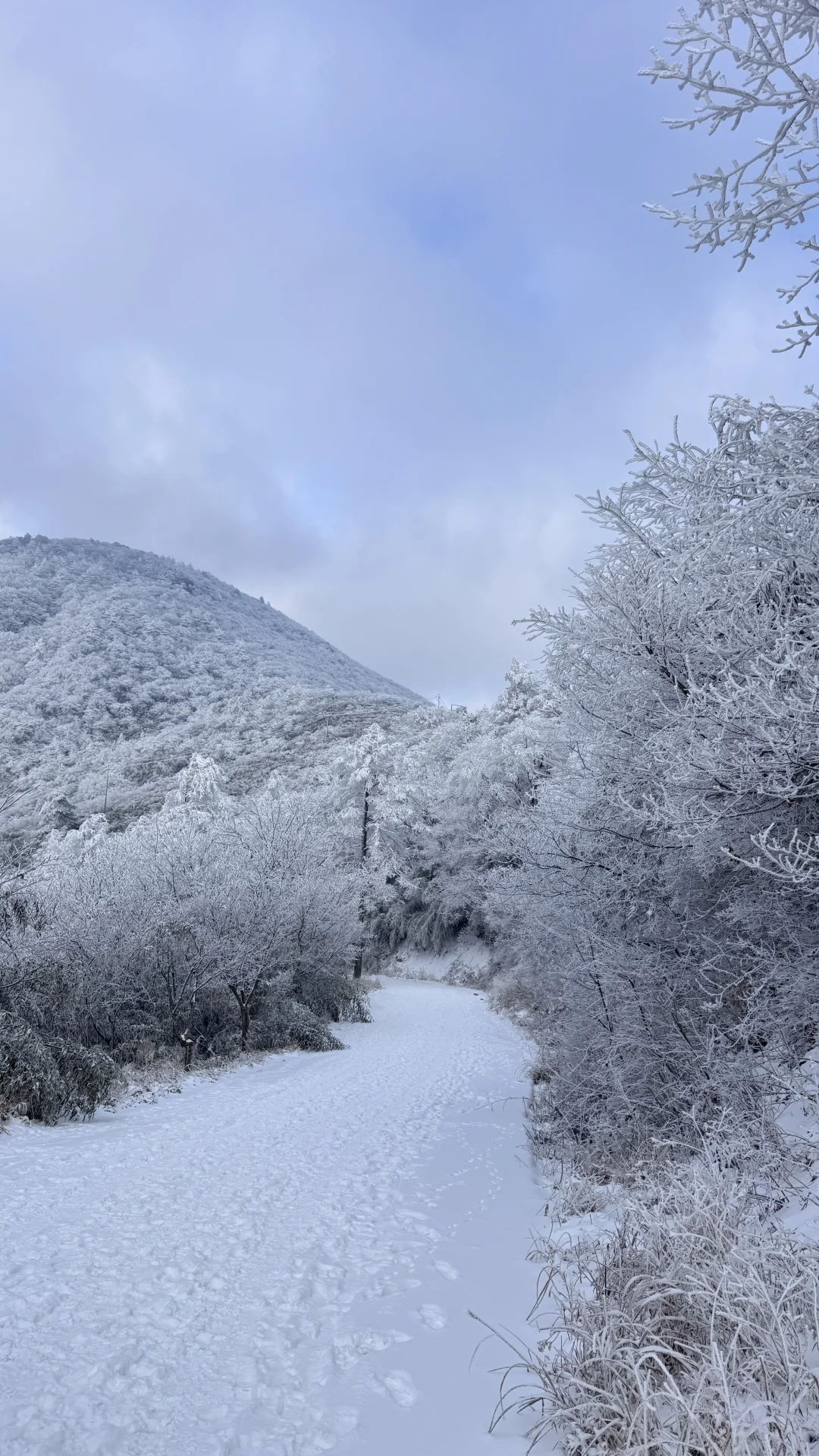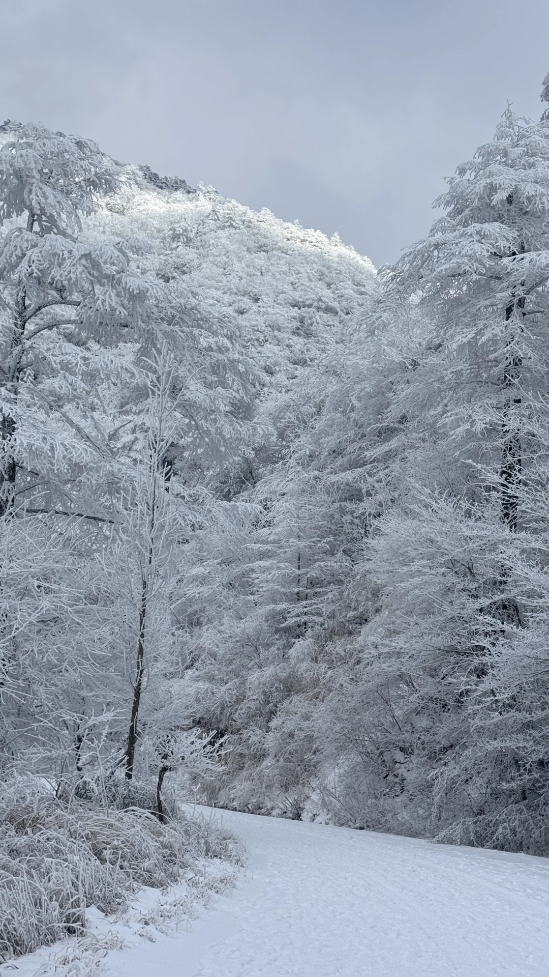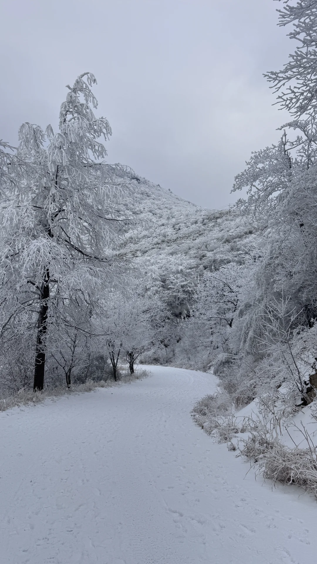 整条山路被雾凇包裹,树木都裹上了厚厚的糖霜。