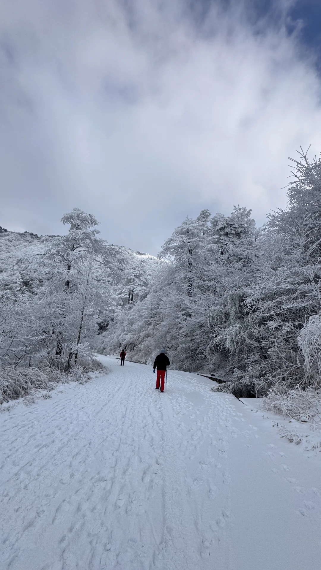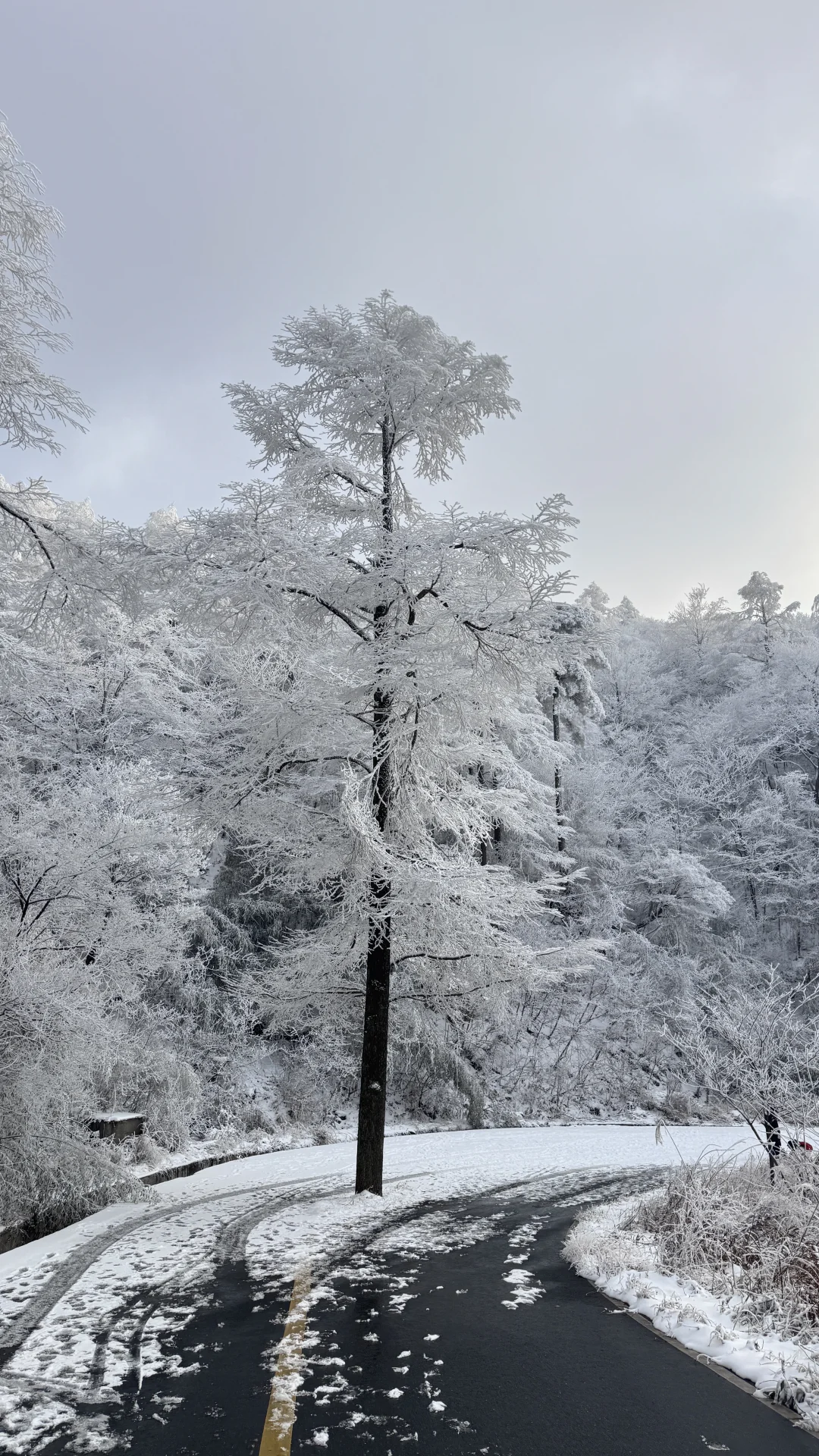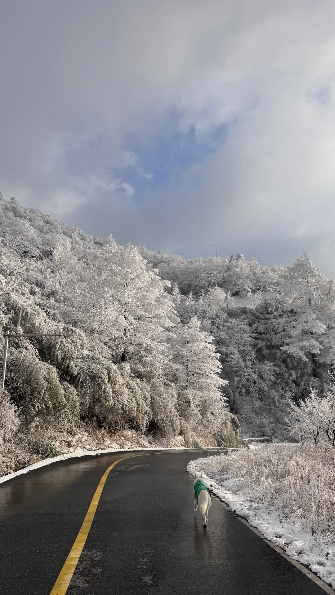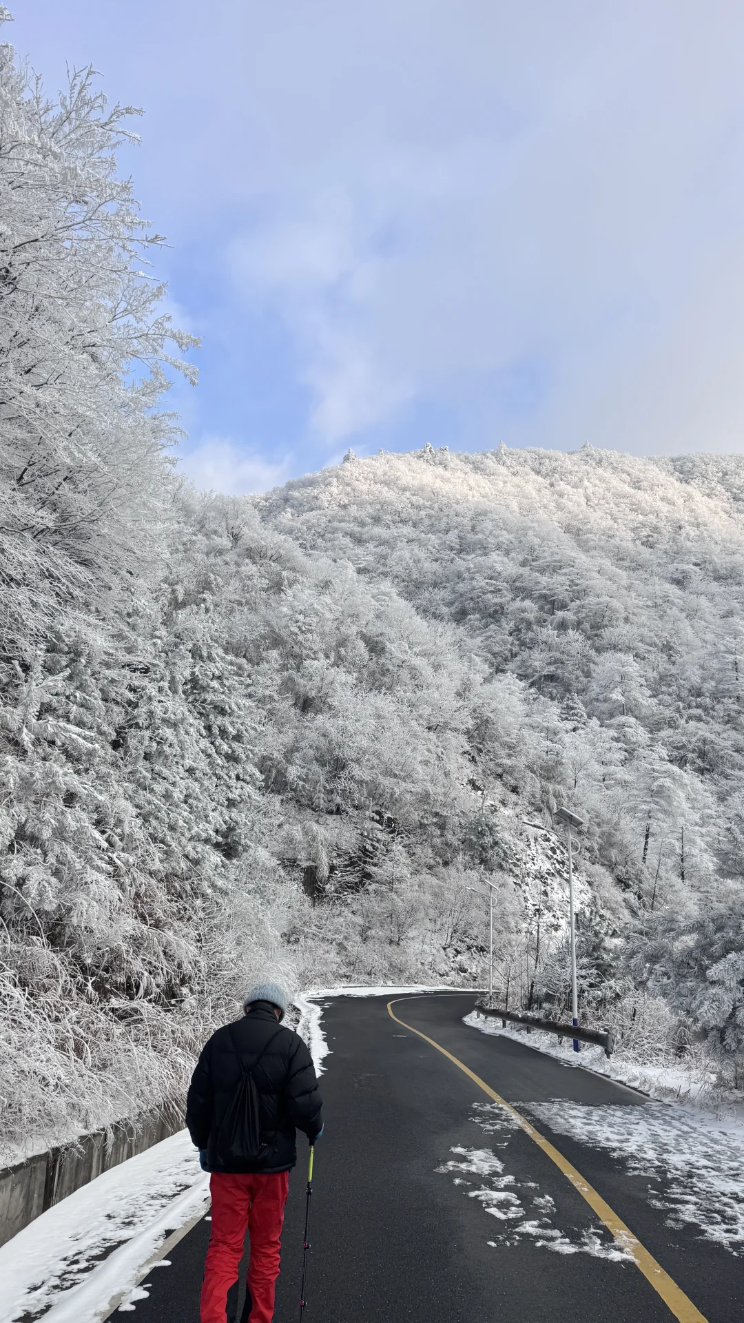 整条山路被雾凇包裹,树木都裹上了厚厚的糖霜。
