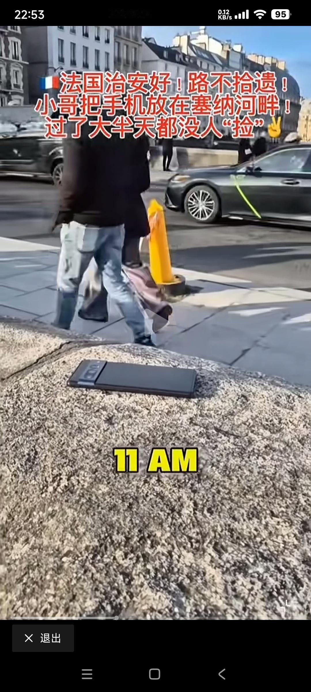 是什么让他缩回了手?原因是人拿着摄像头对着手机拍。 法国小哥为了证明巴黎治安环境好,把一台手机放在路边,几个小时过去了这部手机没有被路人拿走! 手机没有被路人拿走的原因是小哥自己就站在旁边看着。 虽然人在旁边盯着,依然有人想拿走这部手机,被法国小哥制止了。闹乌龙的是法国小哥发布视频时忘记把这一段剪掉! 法国治安不好,在欧洲人众皆知。 只要报团去过法国旅游的人都知道。 导游告诉游客的第一件事就是贵重物品首饰最好收起来,不要露财,还建议游客背包最好反过来抱在怀里背可以时刻盯着,以防被偷抢! 巴黎奥运会期间,澳大利亚自行车选手的自行车被偷,卡塔尔王嫂11个爱马仕包被偷,日本男子七人制橄榄球队队员财物被盗,日本乒乓球运动员早田希娜的教练石田大辅钱包被偷,这些举世皆知的案例,都可以证明巴黎的治安环境很糟糕。