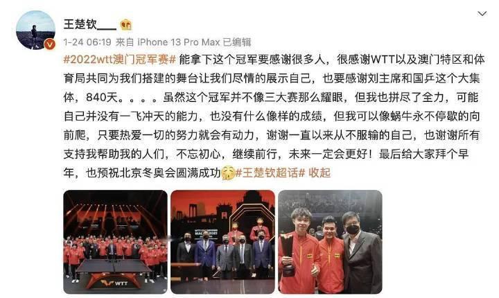 4️⃣周年💐2022年WTT澳门冠军赛2021中国之星840天的磨炼和等待,巴黎周期的第一个男单冠军,一路右直右横左直左横赢下来,特别有意义的一个冠军🏆 !!!谢谢一直以来从不服输的你 👍王楚钦