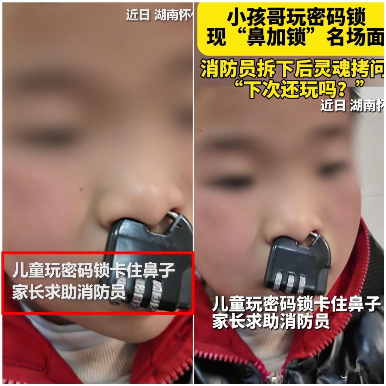 上人民日报了! 湖南怀化一男孩玩密码锁,直接把铁锁环夹在鼻子上,秒变“牛魔王”,家长急得直冒汗,只能求助消防员。 看着视频里孩子乖乖摇头不吭声,又心疼又好笑。 可笑完真的后怕——那是铁锁啊,鼻子软骨那么嫩,万一夹久了压伤、勒破,可不是小事。 孩子的好奇心真没边界,家里的小物件在他们眼里全是“新玩具”。 别等出事才后悔,平时就得把带孔、带缝、能卡人的东西收好,别让随手放的小物件,变成伤娃的“隐形杀手”。 安全这根弦,家长真的一刻都不能松。 你家娃有没有过类似“神操作”? 评论区聊聊,互相提个醒~