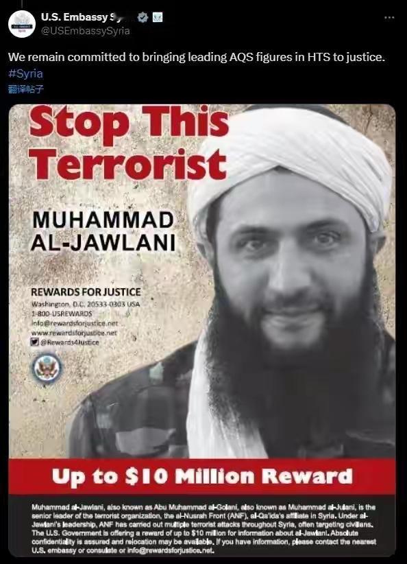 美国特朗普当局认定的恐怖分子朱拉尼,成了美国特朗普当局的盟友朱拉尼。 而美国多年的盟友叙利亚库尔德人却被特朗普像抹布一样抛弃了。 这世界多么可笑。就如那个佛经故事里讲的,一个富翁家里的猪羊投胎变成了人,在席上吃饭,而这家的亲戚投胎变成了猪羊,在锅里煮着。 看看朱拉尼,当年被美国悬赏的通缉令1,000万美元。朱拉尼狡猾到了顶点,真的值这个价钱。