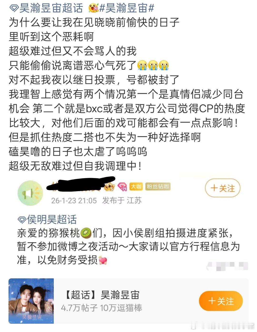 因侯明昊对接说因剧组进度紧张不出席微博之夜,和卢昱晓cpf昊瀚昱宙说吃的很差,对