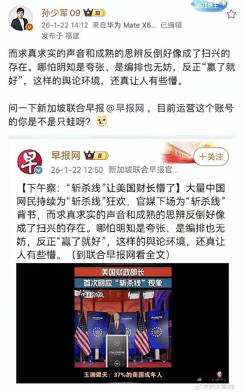它不是蛙,只是站在了美国财长的立场看斩杀线 而已。 不过这也没什么奇怪的,《联合早报》是新加坡的,新加坡一向站在美国的立场看问题。 只是我们村人总有一种错觉,认为新加坡是华人为主的国家,应该和我们站在同一立场。 这是一个最大的错觉。 切记。 点右上角关注我,我们一起去看这个魔幻的世界