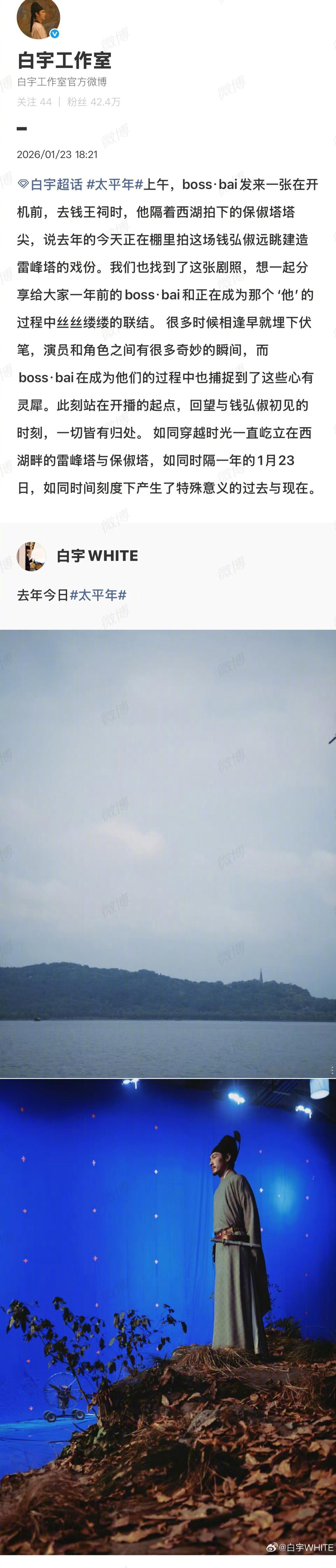 白宇一年前看这个塔一年后看那个塔 宿命感谁懂!白宇开机前拍保俶塔,一年后1月23日新剧开播,去年今日正是他演钱弘俶远眺雷峰塔的时刻!! 从现实西湖到戏中境,双塔之间跨次元相遇,演员与角色的联结太好哭了!