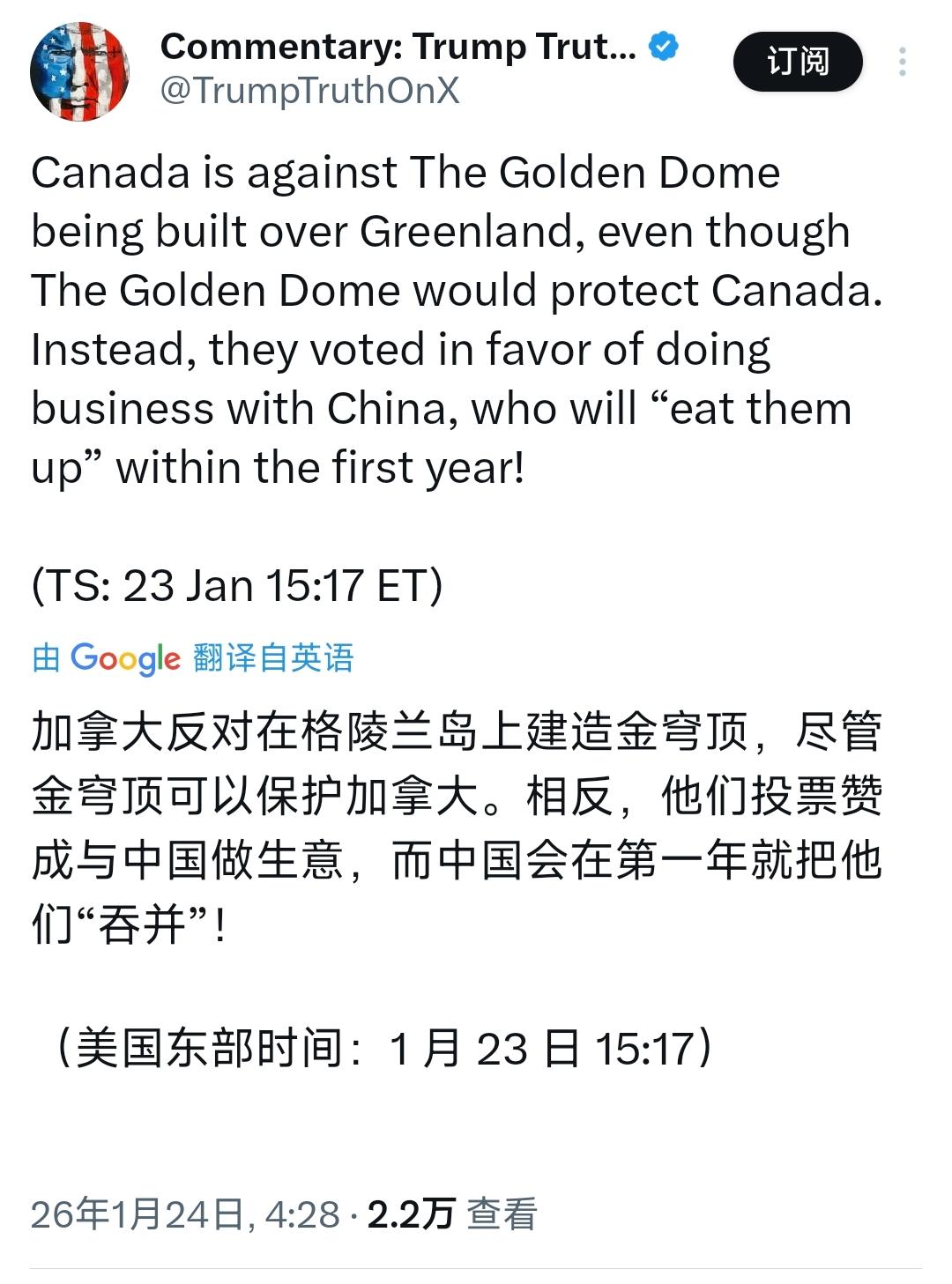 特朗普今天(北京时间1月24日)发文写道:“加拿大反对在格陵兰岛上建造金穹,尽管金穹可以保护加拿大。相反,他们投票赞成与中国做生意,而中国会在第一年就把他们‘吞并’!” [机智]评几句:热知识:美国也跟中国做生意。而且特朗普不是四月也要带礼物去见好朋友吗?美国自家忙着对华经贸往来谋利,却狂喷加拿大对华合作会被“吞并”,这般双标嘴脸荒诞又无耻。特朗普强推格陵兰金穹部署,本质是谋美国北极霸权与稀土利益,拿“保护加拿大”当幌子绑架盟友,遭拒后便泼脏水,将正常经贸污名化。特朗普的言论尽显霸权逻辑:顺美则安、违美则罪,却无视美国才是动辄霸凌盟友、巧取豪夺的始作俑者。