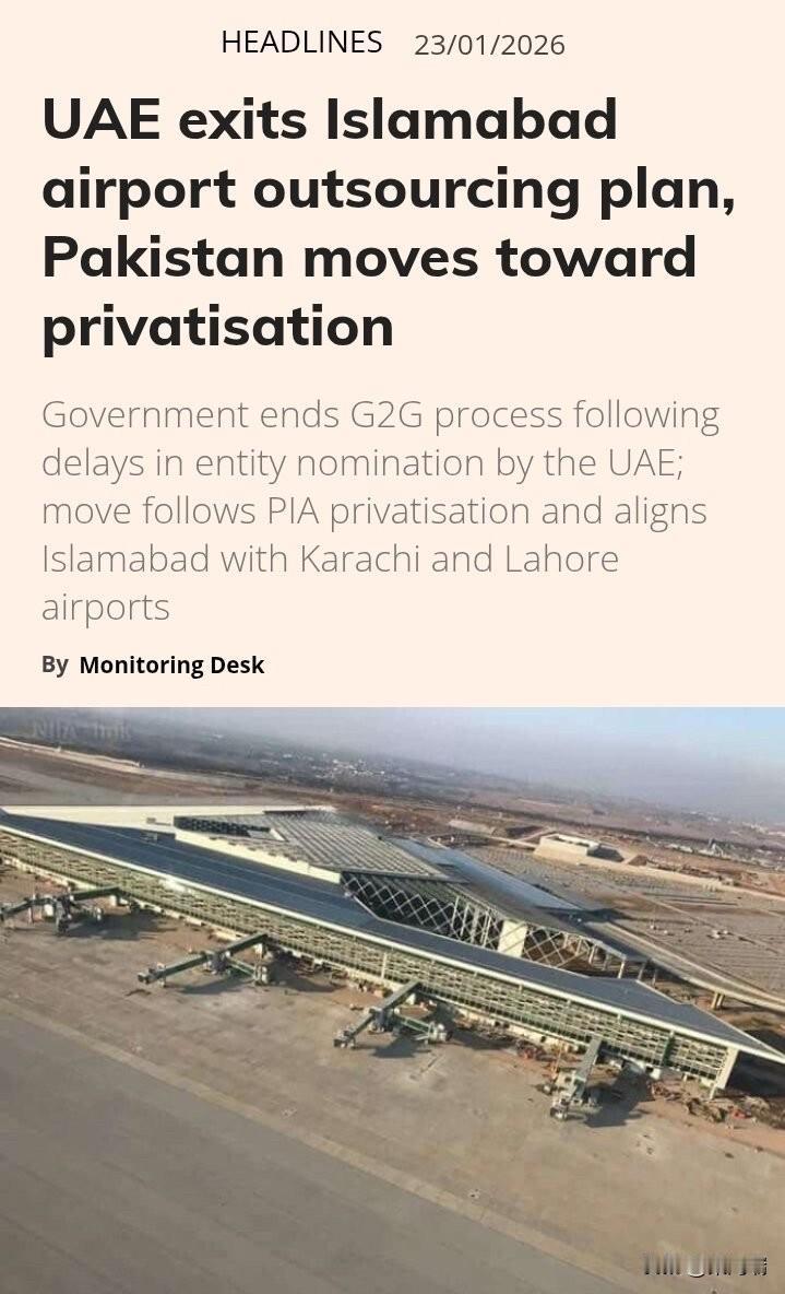 突发新闻:巴基斯坦证实阿联酋退出伊斯兰堡机场外包计划,该国正朝着机场私有化方向发展。 沙特阿拉伯认为这是继巴基斯坦与沙特签署历史性防务协议之后的一次外交胜利——这对阿联酋和印度来说是一次沉重打击。