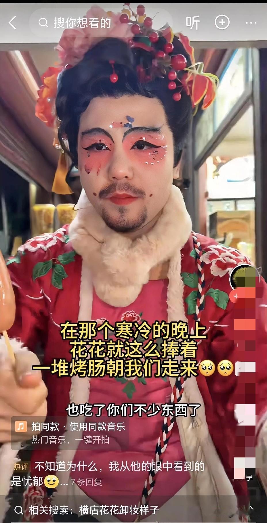 横店花花这朵热热闹闹招人喜欢的“人间富贵花”,眼里偏藏着化不开的忧郁。他大概见多了横店的人来人往,群演的追梦与失意、剧组的喧嚣与散场,都在那双眸子里碾过一遍。可偏偏,他张口闭口的那句句“宝贝”,又软乎乎地裹着多少不掺假的暖意——是给片场疲惫的群演递瓶水时的温柔,是对着镜头耍宝逗乐时的真诚,那些藏在称呼里的爱,像冬日里的小太阳,偏偏和眼底的清冷撞了个满怀,反倒让这个“如花”,多了几分让人忍不住心疼的鲜活劲儿。 花花的待遇 横店如花 花花大赏 横店花花 横店鲜花