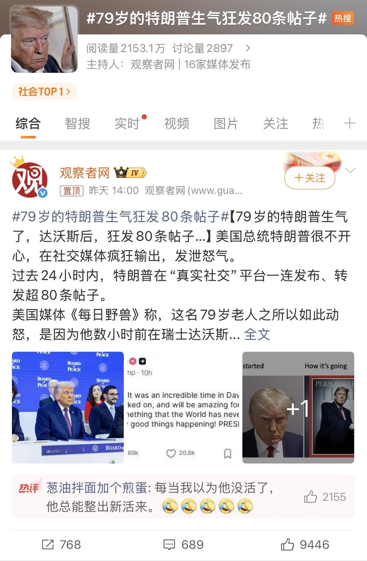 哈哈哈哈哈,太逗了,不愧是特朗普!每当我以为他没活了,作到头了,结果人又整新活出来! 达沃斯回来他生气了,连发80个帖子!气性挺大啊!我服了,我一天都发不了20个帖子! 而且关键你气啥啊,达沃斯上你把想骂的人骂个遍!和平委员会居然也有捧场的!和加州州长不和的家丑也嘚瑟了……你还不满足啊,要多少是多啊,还要啥自行车啊!咋那么贪心呢![捂脸][捂脸][捂脸][捂脸]美欧裂痕对全球政治格局有何影响