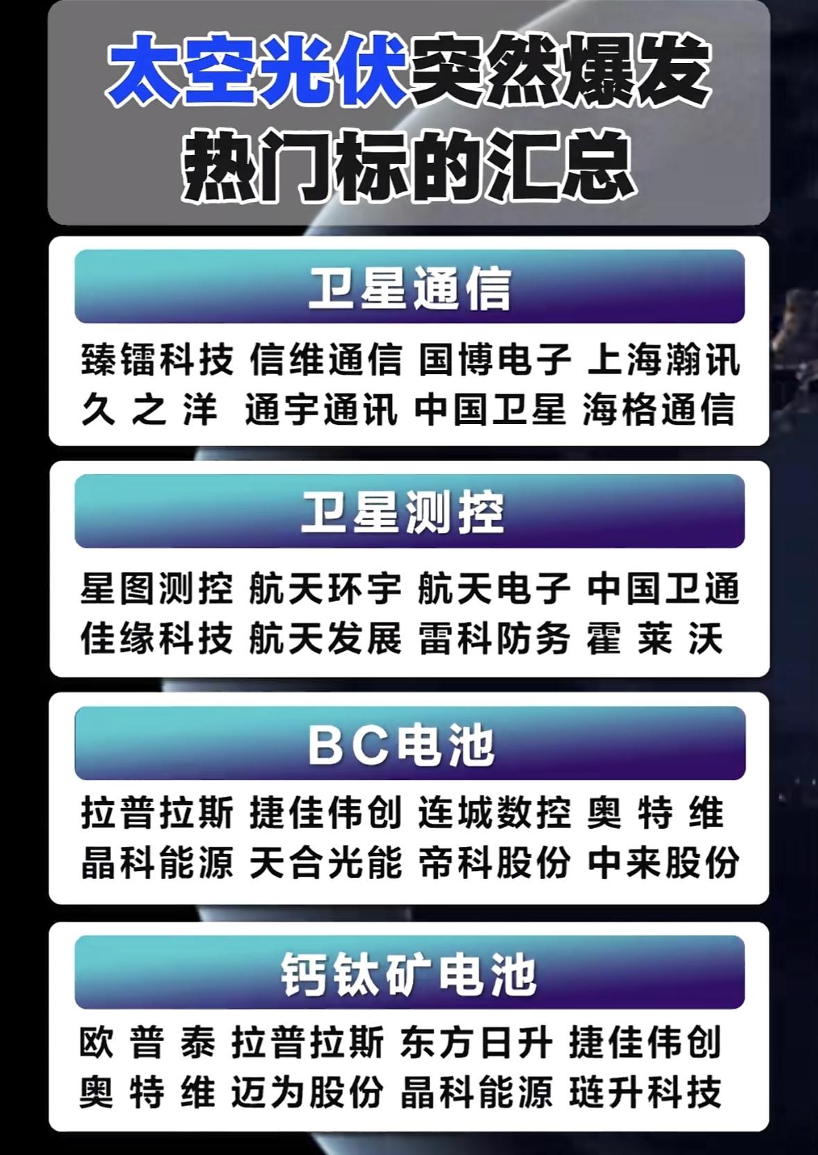 热门标的汇总,抓住投资机遇! 太空光伏赛道火热,光伏设备、火箭发射、卫星通信等概念股集体爆发,涵盖产业链上下游优质标的,投资机会多元。
