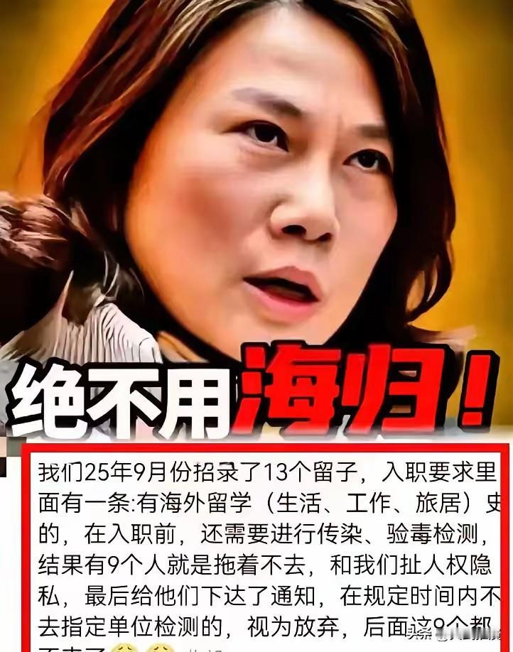 董明珠这回又神预言了。 海归入职拒做体检,拿隐私当借口,这事看着真让人无语,董明珠早前的话果然没说错! 有家公司招了一批海归,入职体检环节直接卡壳。一大半人都不肯去,张口就说体检侵犯隐私,各种理由一大堆。 公司花钱给做体检,就查个传染病、验个毒,在国内职场就是最基本的流程,到这帮海归嘴里,倒成了不能接受的事。 这根本不是什么隐私焦虑,就是端着身段不肯放。在国外待了几年,就学了些所谓的规矩,回来就想让所有人迁就自己。 有网友说,想在国内找工作赚钱,却不肯遵守国内的职场规则,天底下哪有这样的便宜事。 公司招人查体检太有必要,尤其是有海外业务的,要是招到吸毒的人,后续会有太多不可控的事。 笔者认为,别拿西方的所谓人权当借口,这顶大帽子在国内根本行不通。不肯体检,说白了就是不打自招,自己心里有鬼,最后反倒还省了公司的体检费,真是可笑。 对此,你怎么看呢?