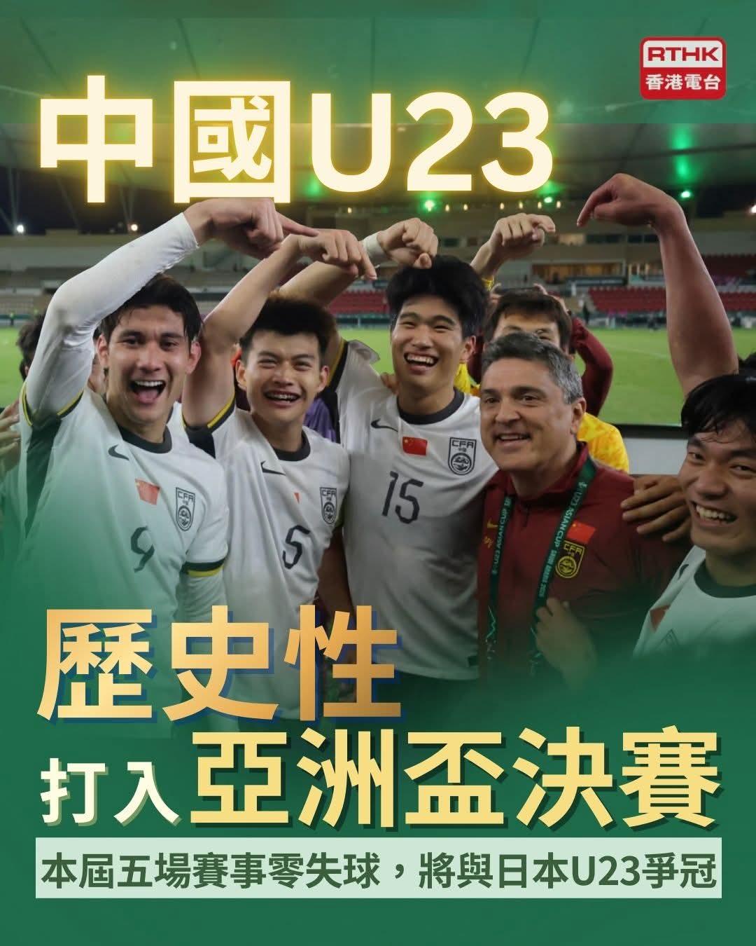 【U23亚洲盃|今晚11时!中国队决战日本!一起支持国家队】 今天(24日)23时,U23亚洲盃决赛即将进行,中国队将对阵日本队。在21日的半决赛中,中国U23男足3∶0完胜越南,历史首次闯入该项赛事决赛。22年的漫长等待,终于在这一刻迎来了突破。 本届U23亚洲盃,中国队的晋级之路可谓一步一脚印,从预选赛的谨慎起步到淘汰赛的爆发,这支年轻队伍展现出了扎实的成长轨迹。 中国U23男足是什麽样的队伍? 说起打入决赛的原因,中国队主教练安东尼奥认为,「我们一起训练了将近50天,所有的球员、教练组做了很多工作,剪了很多视频,我相信每天都收穫一点非常重要。」 对阵越南队通过头球为中国队打破僵局的中后卫彭啸表示,在经历了一场又一场的淘汰赛、小组赛后,「积累下来的信心让我们这个团队凝聚力更强,在场上的战斗力也更强。」 在23日的赛前发布会上,中国队主教练安东尼奥表示,拿冠军对中国队是非常大的梦想,球队会全力战斗,「我们的心态非常棒,球员们对自己有信心,在足球比赛裏,相信自己是很重要的。」他说,「我们知道日本队整体实力很强,不仅仅在亚洲,他们在世界足坛层面也是如此,这就是现实情况。我们会尽最大努力,肯定会全力战斗。足球世界很现实,但有时候也会发生非凡的事情。我们会去尝试,让不寻常的事情发生。」 队员胡荷韬表示,「作为球员,有机会来到这个舞台很荣幸,决赛不是简单的事情,我们做好了应对困难的准备。与日本队交手肯定是困难的,但我们不能放弃,希望创造新的历史!」 无论决赛结果如何,这支U23国足都已经创造了历史。今夜,多哈的夜空将见证中国足球新一代的挑战,22年的等待已经结束。新的历史正在被书写,让我们一起为中国U23男足加油! 中国队VS日本队决赛转播计划 时间:北京时间2026年1月24日 23:00 地点:阿卜杜拉·阿尔·费萨尔王子体育场 平台:CCTV5、央视体育客户端、央视频、爱奇艺体育、奇异果TV、咪咕视频等 十人越南U23点胜韩国 获亚洲杯季军日本U23主帅:中国队有强大优点