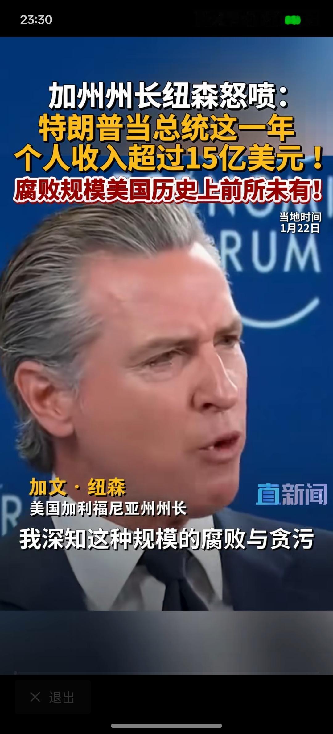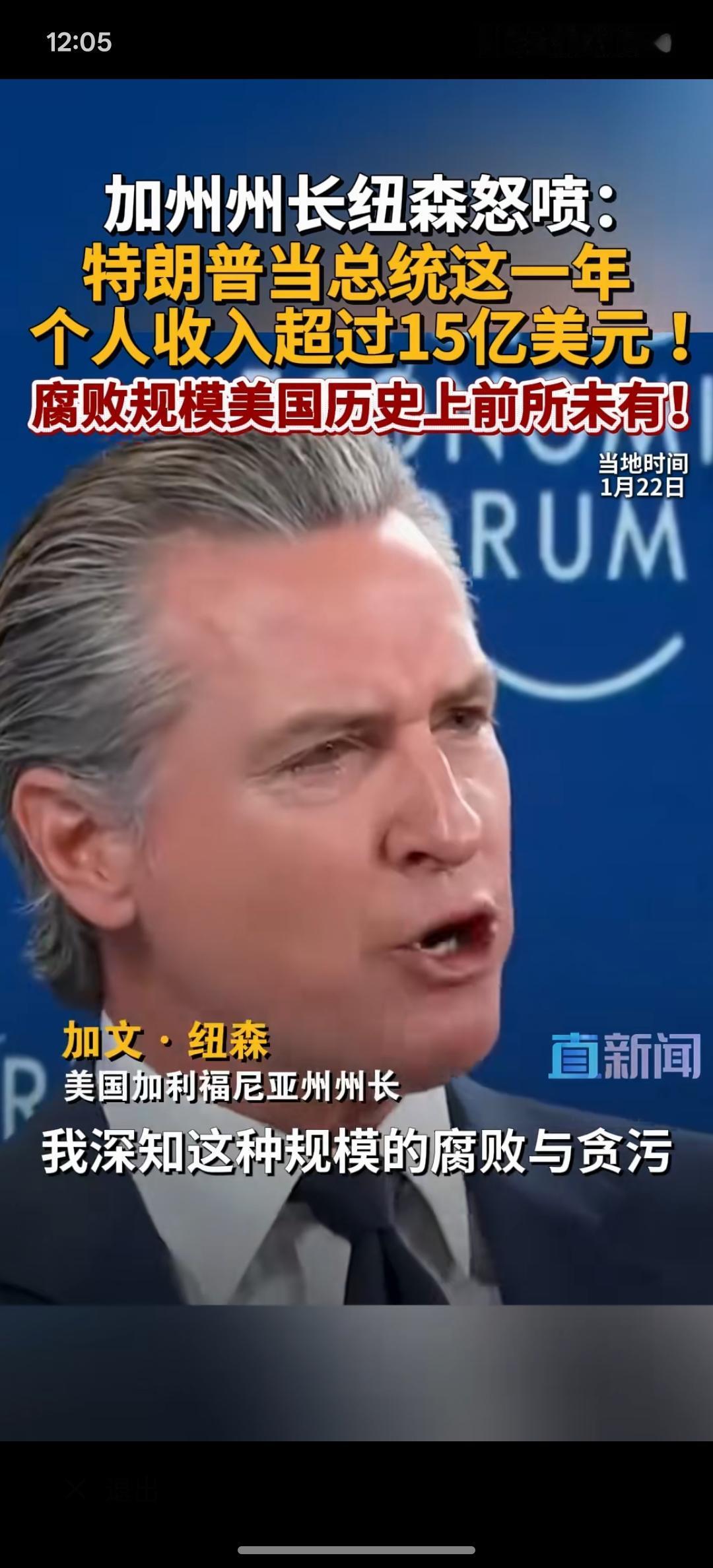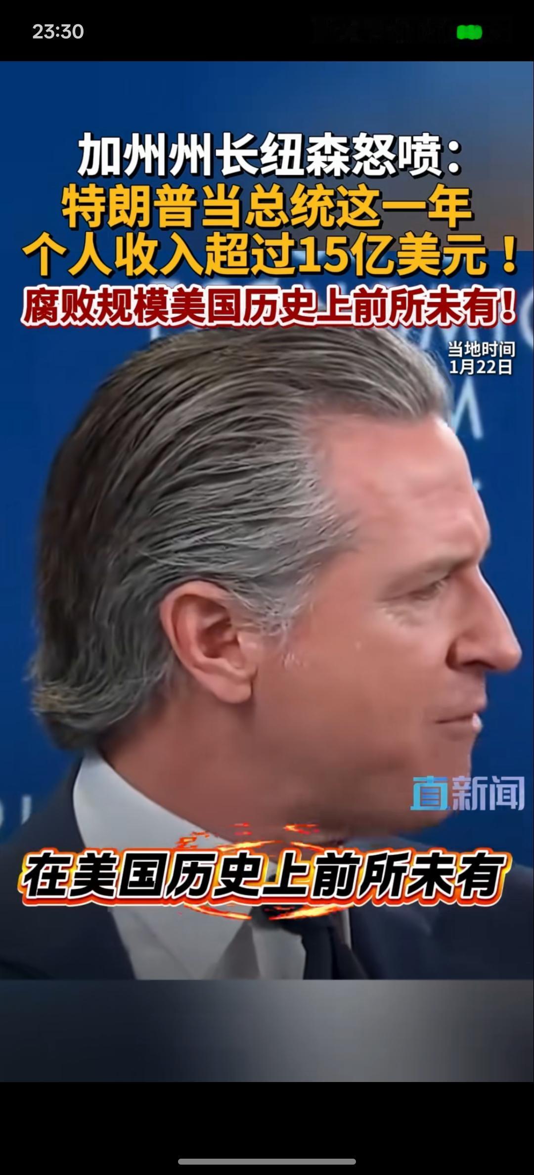 特朗普有贪污腐败的现象!美加州州长纽森:特朗普当总统这一年个人收入超过15亿美元,腐败规模在美国历史上前所未有! 这一次,美国加州的州长纽森却对特朗普发起了前所未有的进攻!在达沃斯论坛上面,特朗普一直在嘲讽纽森! 如果特朗普真的大规模的贪污腐败,那美国政坛又会发生什么?按照现在这样的发展下去,特朗普真的有可能有这种迹象!美国最近大规模的对外开始掠夺资源!那有没有一种可能?特朗普从中拿到好处!