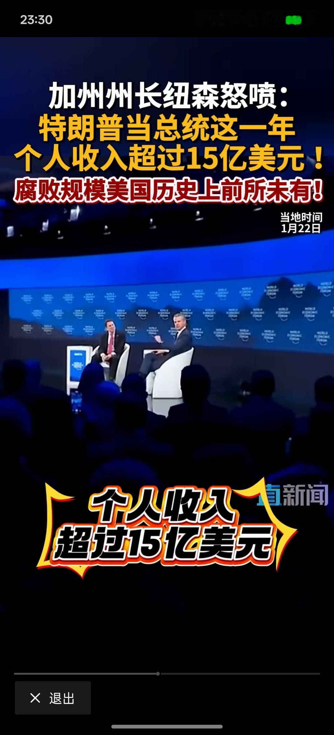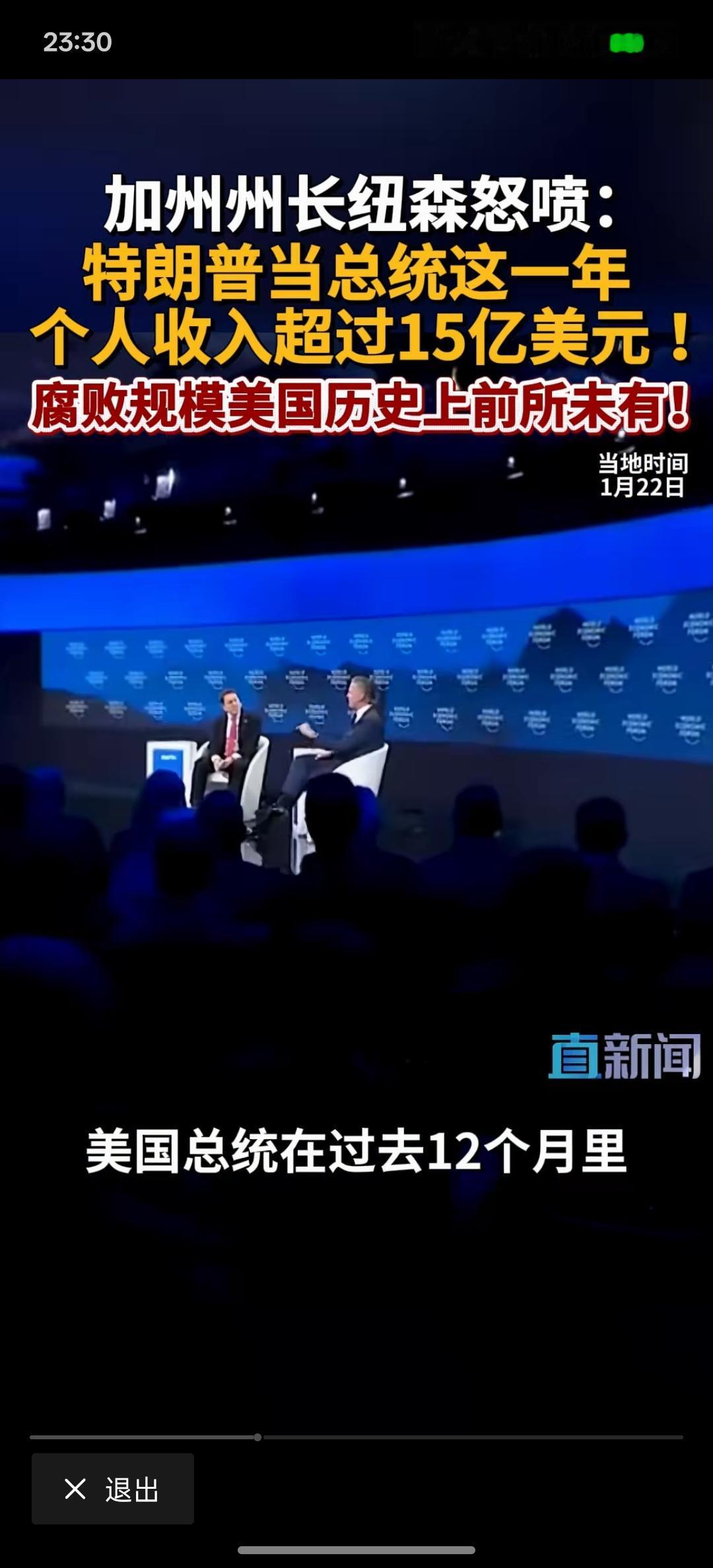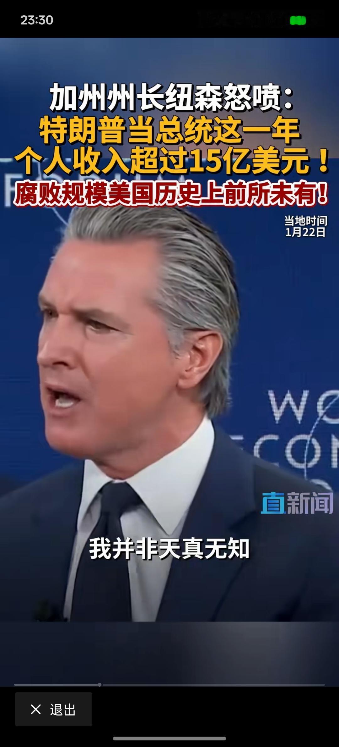 特朗普有贪污腐败的现象!美加州州长纽森:特朗普当总统这一年个人收入超过15亿美元,腐败规模在美国历史上前所未有! 这一次,美国加州的州长纽森却对特朗普发起了前所未有的进攻!在达沃斯论坛上面,特朗普一直在嘲讽纽森! 如果特朗普真的大规模的贪污腐败,那美国政坛又会发生什么?按照现在这样的发展下去,特朗普真的有可能有这种迹象!美国最近大规模的对外开始掠夺资源!那有没有一种可能?特朗普从中拿到好处!