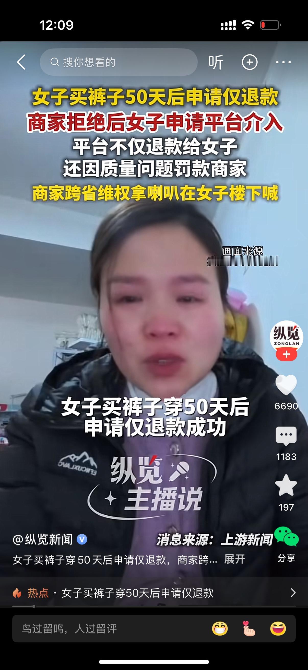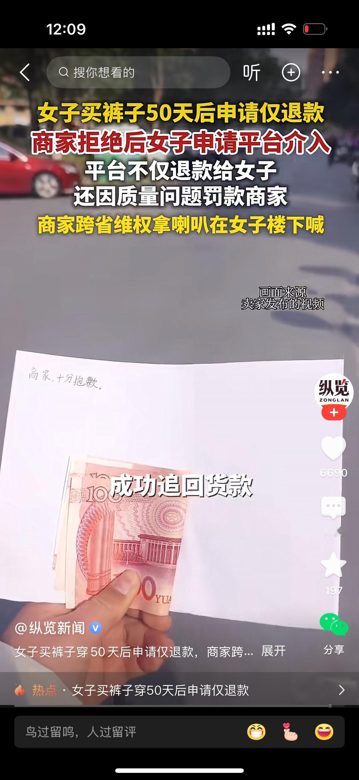 女子买裤子50天后申请仅退款。商家拒绝后,女子申请平台介入。平台不仅退款给女子,还因质量问题罚款商家。商家不服,跨省维权,拿喇叭在女子楼下喊。最后,女子诚恳道歉,商家成功追回货款。现在一些平台不分青红皂白就给顾客仅退款,处罚商家,让一些别有用心的人钻了空子,有点助纣为虐的赶脚。