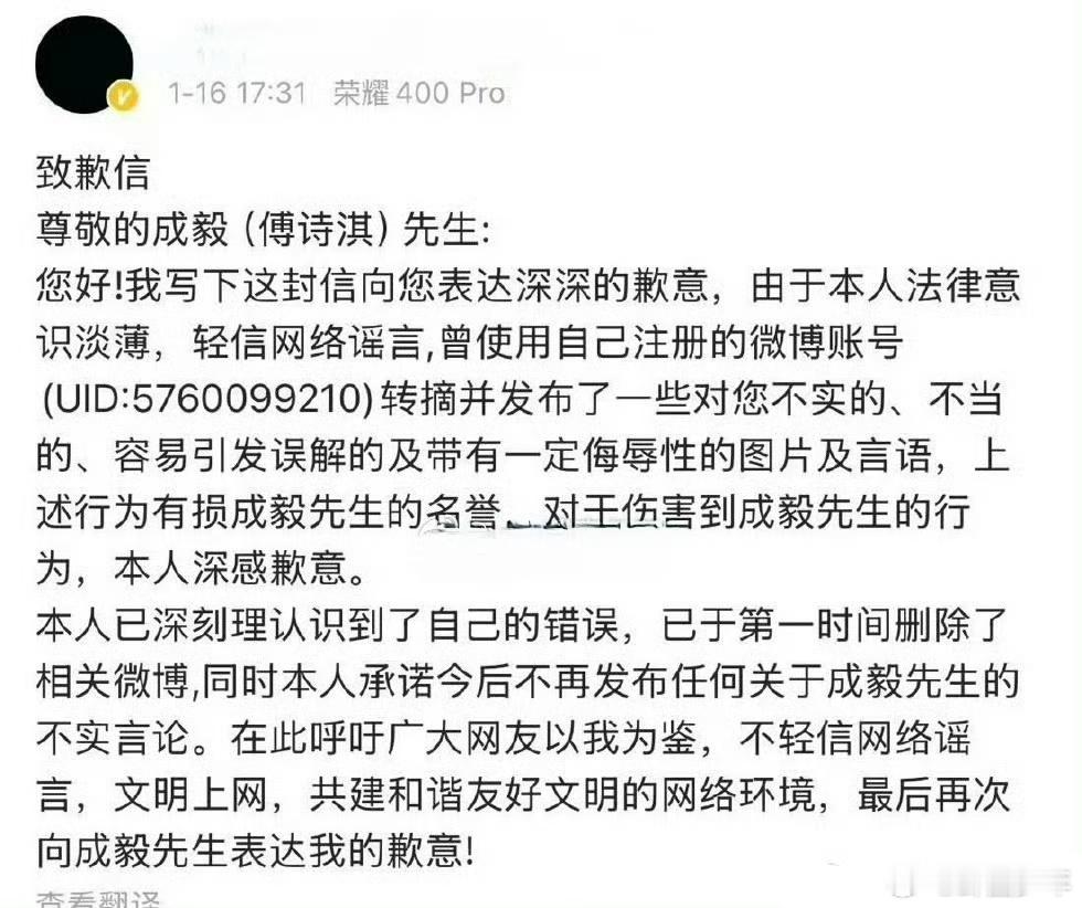 黑粉给成毅的道歉信黑粉给成毅道歉 相关黑粉就针对成毅的不当言论发布道歉信,该事件也让大众再次意识到,网络不是法外之地,违法违规言行终将承担相应后果。