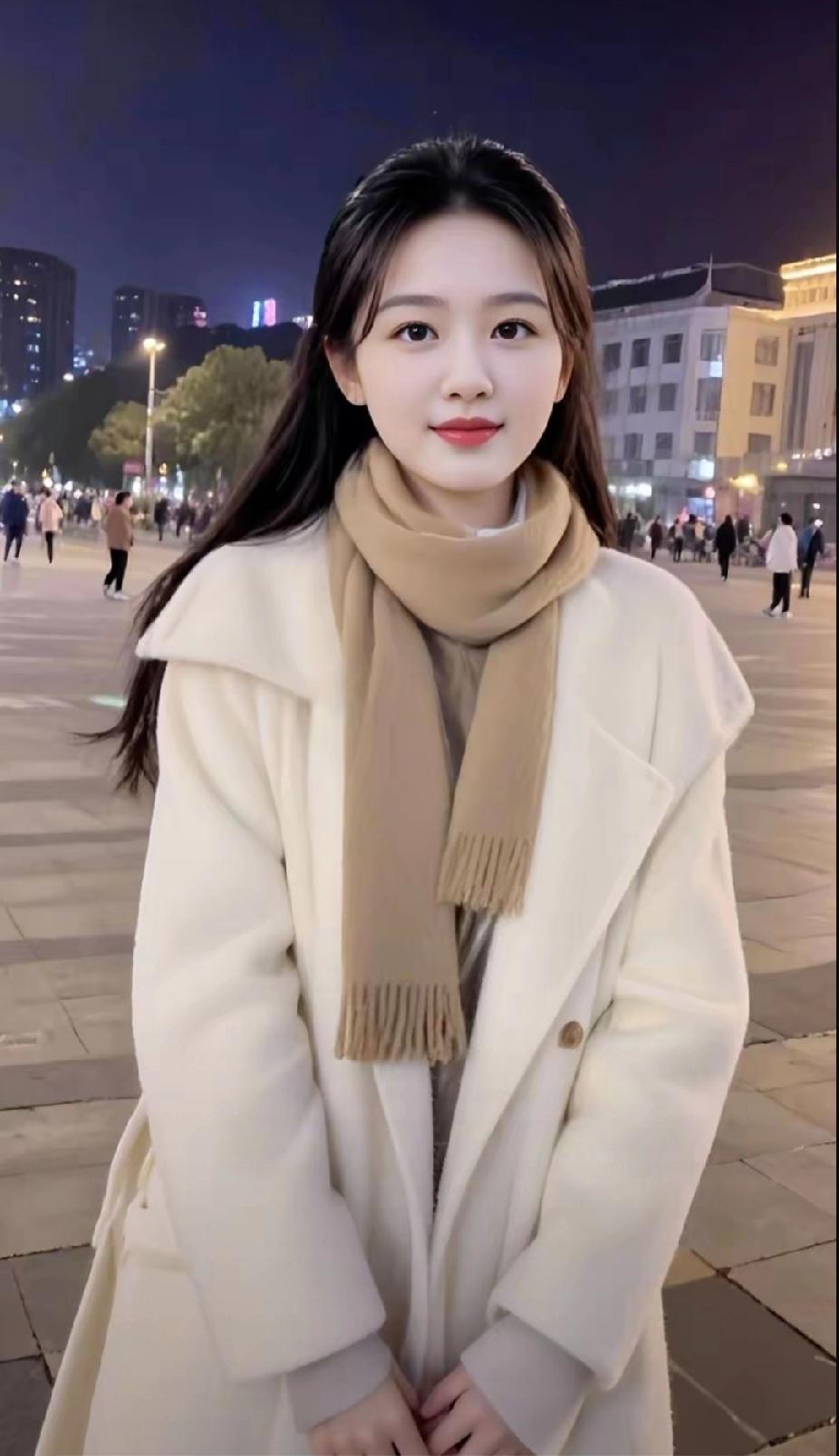 冬日暖阳下,温柔白大衣与米色围巾的完美搭配,尽显冬日时尚感。