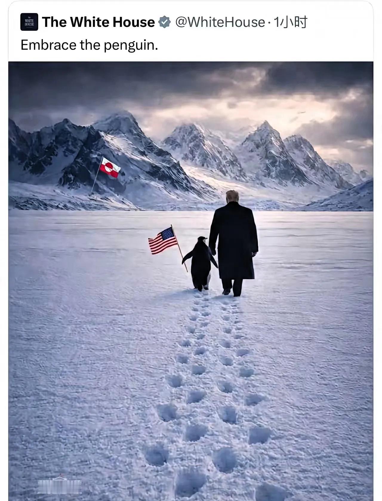 特朗普又闹了个大笑话。 白宫刚刚发了一张官方P图,特朗普牵着企鹅,企鹅拿着星条旗,走在茫茫的格陵兰岛雪地里,留下脚印一串串。 配文是“拥抱企鹅”。 明摆着还惦记着格陵兰岛,可北极的格陵兰岛压根没有企鹅,这低级错误让丹麦人都哭笑不得。 说到底,这张闹笑话的图,不过是特朗普觊觎格陵兰岛的又一拙劣表演,为了抢岛连基本地理常识都不顾,满脑子都是地缘利益和资源算计,连表面的严谨都懒得装。 所谓的“拥抱”哪里是喜欢这片土地,不过是想把格陵兰岛的战略价值和矿产资源攥在手里,这种急功近利的心思,被一个企鹅的常识错误暴露得彻彻底底。 连基础常识都能出错的操作,谈何掌控一片土地?
