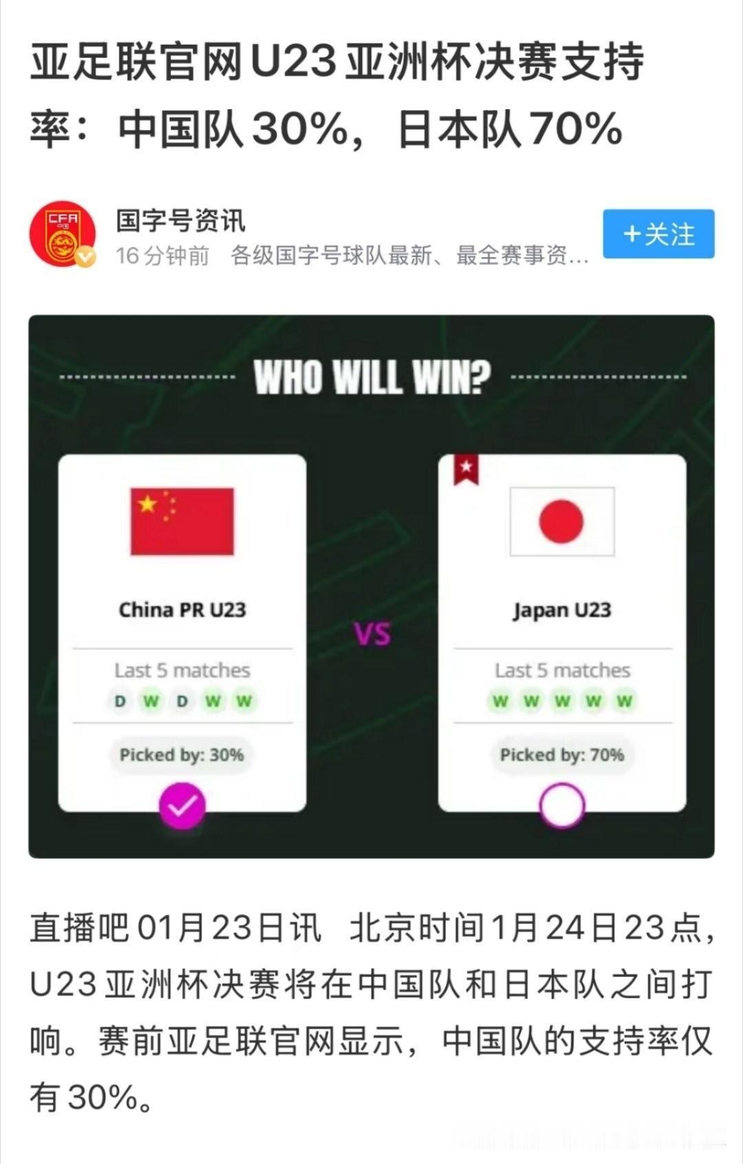 我敢说亚足联官网上关于U23亚洲杯决赛支持率投票中, 30%中国队的应该90%都是中国球迷在投, 另外还有10%可能是越南球迷, 毕竟半决赛打了他们一个3-0, 要是决赛中国队再干掉日本队夺冠, 越南队也可以骄傲的说他们只是输给了冠军。 要是日本队夺得冠军, 他们的面子更挂不住了。