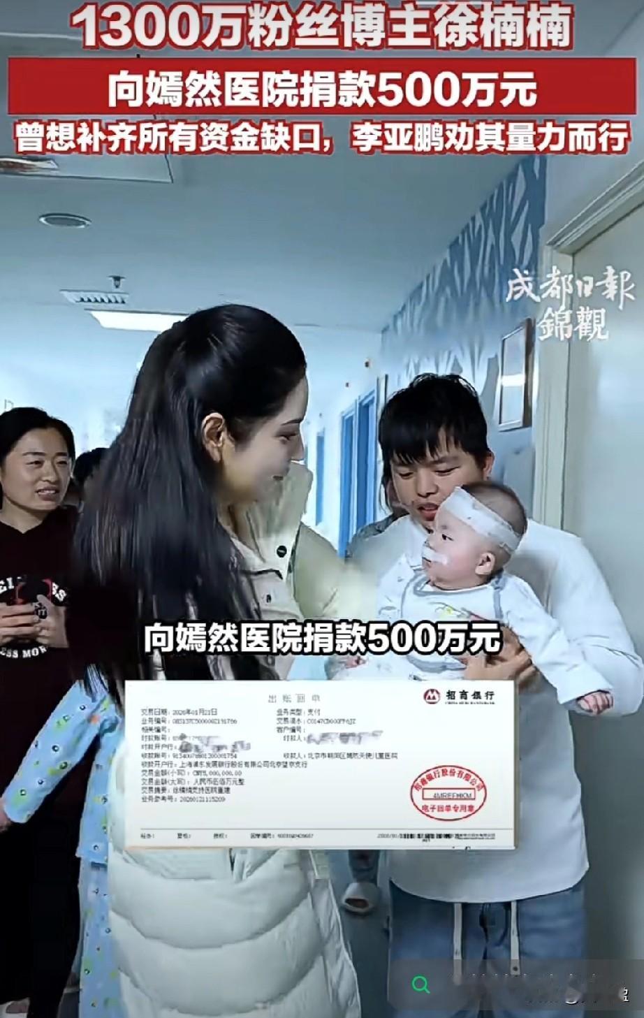网红是真有钱啊,不过干正事值得,我要有钱我也会这样捐款。 1300万粉丝博主徐楠楠向嫣然医院捐款500万元,曾想补齐所有资金缺口,李亚鹏劝其量力而行,都是大爱之人!
